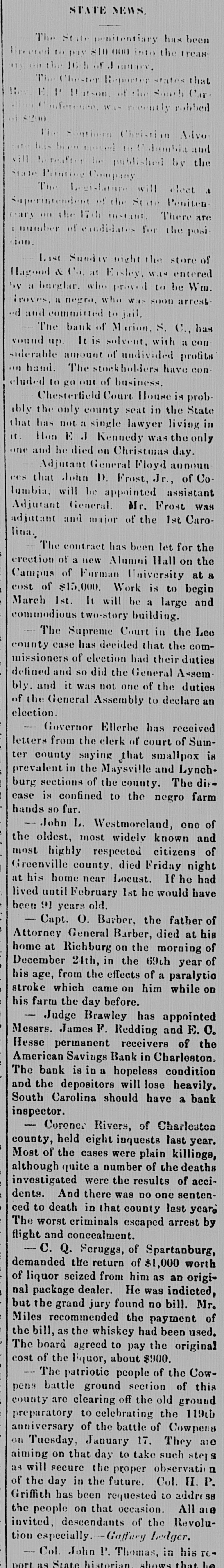 STATE NEWS. The State penitentiary has been directed to pay $10000 into the treasary on the 16th of January. The Chester Reporter states that Rev. E. P. Hatson. of. the South Carlina Conference, was recently robbed of $200. The Southern Christian Advoate has been moved to Columbia and will hereafter be published by the State Printing Company. The Legislature will 'elect a Superintendent of the State Penitenon the 17th instant. There are trary number of candidates for the posicion. - Last Sunday night the store of Hagood & Co. at Eisley, was entered Wm. by a burglar, who proved to be Groves, a negro, who was soon arrestand committed to jail. The bank of Marion, S. C., has wound up. It is solvent, with a considerable amount of undivided profits on hand. The tockholders have concluded to go out of business. Chesterfield Court House is prob- State the only county seat in the in that ably has not a single lawyer living only it. Hon E J Kennedy was the one and he died on Christmas day. Adjutant General Floyd announ- of Cothat John D. Frost, Jr., ces lumbia, will be appointed assistant was Adjutant General. Mr. Frost Caroadjutant and major of the 1st lina. The contract has been let for the the erection of a new Alumni Hall on at Campus of Furman University begin a of $15,000. Work is to and cost March 1st. It will be a large commodious two-story building. - The Supreme Court in the com- Lee case has decided that the duties missioners county of election had their Assemand so did the General duties defined and it was not one of the declare an of bly. the General Assembly to election. Governor Ellerbe has received Sum- from the clerk of court of is letters saying that smallpox ter prevalent county in the Maysville and The Lynch- dissections of the county. farm ease burg is confined to the negro hands so far. John L. Westmoreland, one and of oldest, most widely citizens known of the respected Greenville most highly county, died Friday If he night had home near Locust. have at his lived until February 1st he would been 91 years O. old. Barber, the father at his of Attorney Capt. Richburg General Barber, on the died morning of of home December at 24th, in the 69th paralytic year from the effects of a while on stroke his age, which came on him the day before. Messrs. farm Brawley has appointed and E. C. Judge James F. Redding of the receivers Hesse permanent Bank in Charleston. American bank Savings is in a hopeless condition heavily. The depositors will lose a bank and South the Carolina should have inspector. Coroner Rivers, of Charleston last year. inquests county, held eight were plain killings, Most of the cases number of the deaths although quite were a the results of senten- acciinvestigated And there was DO one yesTo dents. that county last by ced The to worst death criminals in escaped arrest flight and concealment. of Spartanburg, demanded from him - C. Q. the Scruggs, return of *1,000 as an worth origiof nal liquor package seized dealer. found He was no bill. indicted, Mr. of grand jury payment Miles had but the recommended the whiskey the been original used. the bill, board as agreed to pay $900. the cost The the liquor, about of The patriotic people section of the of Cow- this county pens - battle are clearing ground celebrating off the old the ground 119th preparatory of to the battle of They Cowpers are anniversary January 17. such sters aiming on Tuesday, on that the day proper to take observation Col. H.P. day in to of as will the secure been the requested future. address All a1e Griffith has occasion. on of the Revoluthe people descendants that Ledger. that invited, tion especially. P. Gaffney Thomas, in his rc- be as Col. State John historian, records shows of Core port complete Co1. federate has gotten soldiers from this State.