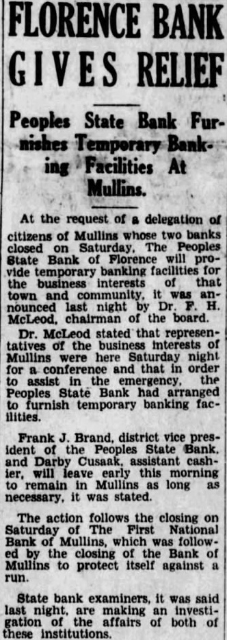 FLORENCE BANK RELIEF Peoples State Bank FurTemporary Facilities At the request of a delegation of citizens of Mullins whose two banks closed The Peoples State Bank of provide banking for the business interests that town and was nounced night McLeod. chairman of the board. Dr. stated that representatives of the interests of Mullins were here Saturday night conference and that order assist in Peoples Bank arranged furnish temporary banking facilities. Frank Brand, district vice president the Peoples State Bank. and Darby Cusaak, cashwill early this remain in Mullins long necessary, it stated. The action follows the closing on Saturday First National Bank Mullins, which was followthe closing the Bank of Mullins to protect itself against run. State bank examiners, it said last night, making an investigation affairs both of these