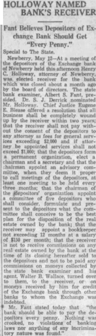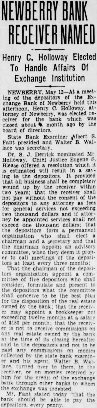 NEWBERRY BANK RECEIVER Henry C. Holloway Elected To Handle Affairs Of Exchange Institution NEWBERRY. May meeting of the depositors of the Exchange Bank of held this afternoon, Henry Holloway attorney of elected receiver for the bank which was closed about month ago by the board of directors. State Bank Examiner Albert S. Fant Walter B. Wallace was secretary. Dr. S. J. Derrick nominated Mr Holloway. Chief Justice Eugene Blease offered resolution which it is estimated will result in ing to the depositors It provided that all be completely wound up by the within two years; that the receiver shall not pay the consent of the depositors to any attorney as fees for general services not exceeding two thousand dollars and attorney be appointed services shall not exceed one thousand dollars: that the depositors form permanent organization who shall elect and secretary and that the chairman appoint an advisory when they deem proper to call meetings of the depositors least every three months: That the chairman the depositors organization appoint committee of five depositors who shall consider, formulate and present to the depositors what the conceive to the best plan for the of the real estate owned by the bank; that the er may appoint bookkeeper not exceeding twelve months salary of $150 per month: that the receiver is not to receive on any real estate owned by the bank at the time its closing hereafter sold to the depositors not to be paid any on monies the bank examiner and his agent, Walter Wallace. turned to them. the receiver on received by him for the credit the exchange bank through other banks to whom the exchange was indebted Mr. Fant stated today "that the bank should be to pay the depositors, every penny