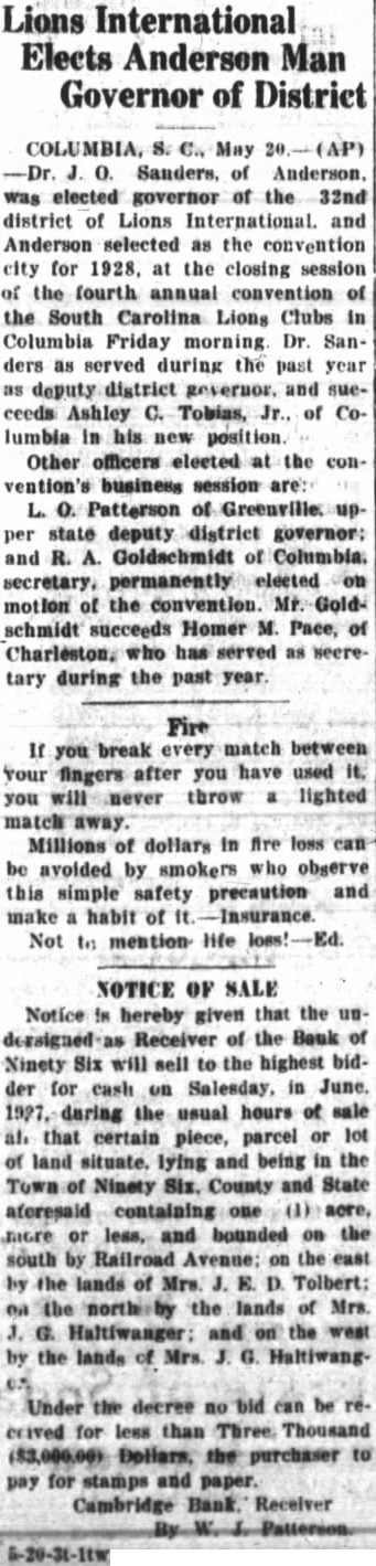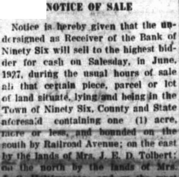 NOTICE OF SALE Notice in hereby given that the unersigned NO Receiver of the Bank of Ninety Six will sell to the highest bidder for cash on Salesday, in June. 1927. during the usual hours of sale all that certain piece, parcel or lot of land situate, lying and being in the Town of Ninety Six, County and State afcresaid containing one (1) scre, more or less, and bounded on the south by Railroad Avenue: on the east by the lands of Mrs. J. E. D. Tolbert: on the north by the lands of Mrs. J. G. Haltiwanger; and on the west by the lands of Mrs. J. G. Haltiwang-