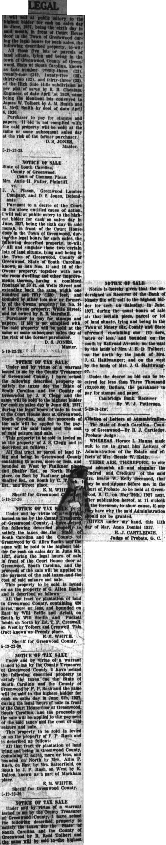 NOTICE OF TAX SALE Under and by virtue of a warrant issued to me by the County Treasurer of Greenwood County, have seized the following described property to satisfy the taxes due the State of South Carolina and the County of Greenwood by J. 8. Clegg and the same will be sold to the highest bidder for cash on sales day in June 8th, 1927 during the legal hours of sale in front of the Court House door at Green wood, South Carolina, and the proceeds of the sale will be applied to the pay. ment of the said taxes and the cost of said seizure and sale. This property to be sold is levied on as the property of J. S. Clegg and is described as follows: All that tract or parcel of land is. ing and being In Greenwood County containing 85 acres, more or less, and bounded on West by Faulkner and Shaffer Est., on North H place, on East by Faulkner Shaffer Est., on South by Est., and Street place. E. M. WHIT Sheriff for Greenwood 5-19-23-30.