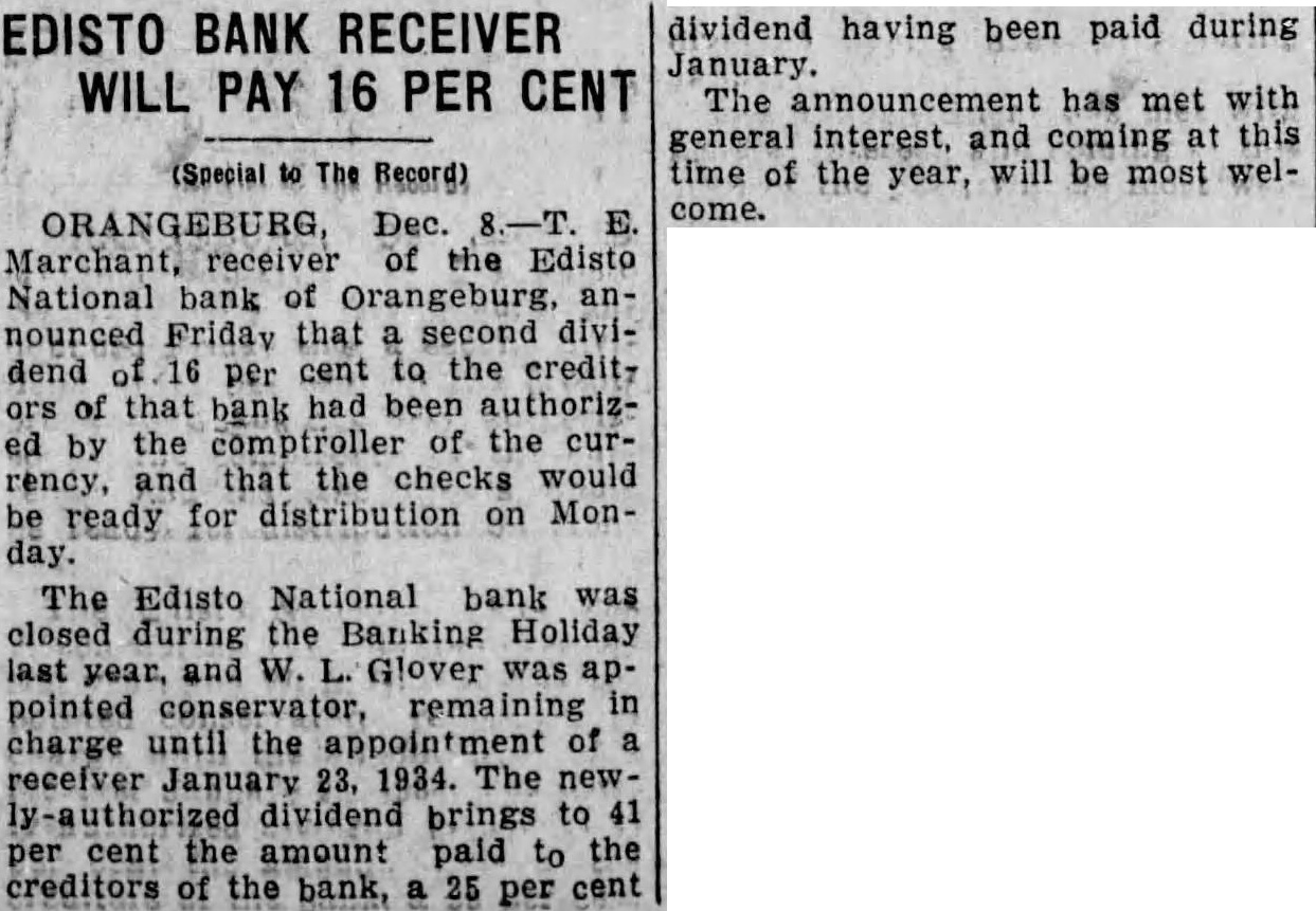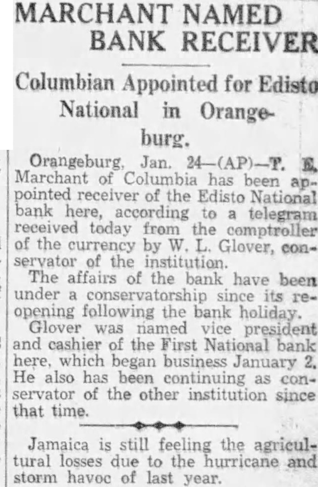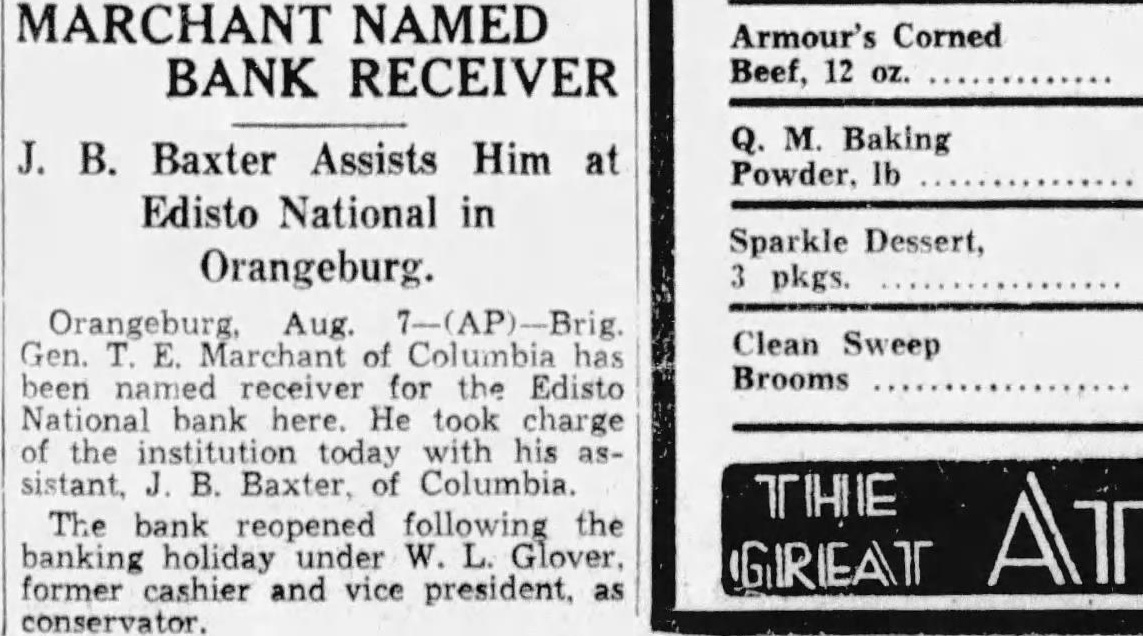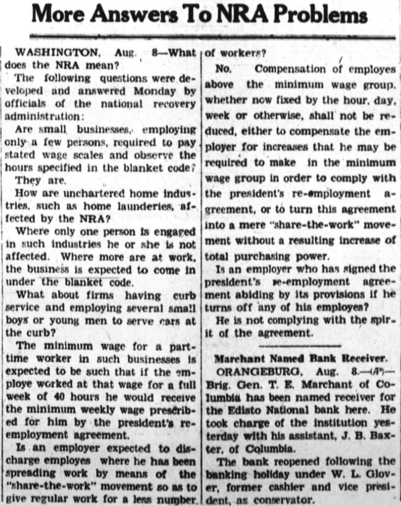 More Answers To NRA Problems Aug. does the NRA mean? The following questions were developed and answered Monday by officials of the national recovery administration: Are small businesses. employing only few persons, required to pay stated wage scales and observe the hours specified in the blanket code? They How are unchartered home Industries, such as home launderies, affected by the NRA? Where only one person is engaged in such industries he or she is not affected. Where more are at work, the business is expected to come in under the blanket code. What about firms having curb service and employing several small boys or young men to serve cars at the curb? The minimum wage for parttime worker in such businesses expected to be such that if the employe worked at that wage for full week of 40 hours he would receive the weekly wage prescribed for him by the president's employment agreement. Is an employer expected to discharge employes where he has been spreading work by means of the movement so to give regular work for less number. of workers? No. Compensation of employes above the minimum wage group. whether now fixed by the hour, day, week or otherwise, shall not be reduced, either to compensate the em- ployer for increases that he may be required to make in the minimum wage group in order to comply with the president's re-employment greement, or to turn this agreement into mere movement without resulting increase of total purchasing power. Is an employer who has signed the president's re-employment agreement abiding by its provisions if he turns off any of his employes? He is not complying with the spirit of the agreement. Marchant Named Bank Receiver. ORANGEBURG. Aug. Brig. Gen. E. Marchant of Columbia has been named receiver for the Edisto National bank here. He took charge of the institution yesterday with his assistant, J. B. Baxter. of Columbia. The bank reopened following the banking holiday under W. L. Glover, former cashier and vice president, as conservator.