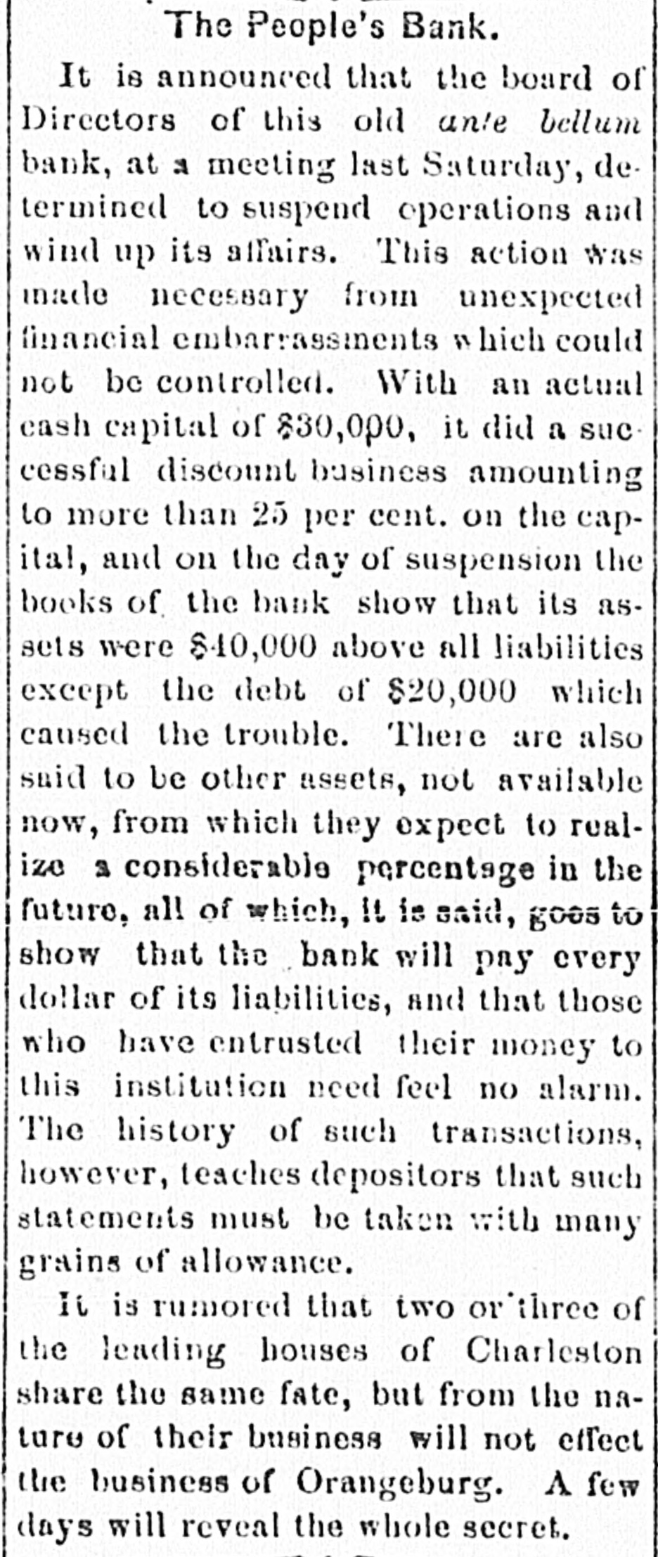 The People's Bank. It is announced that the board of Directors of this old ante bellum bank, at a meeting last Saturday, determined to suspend operations and wind up its affairs. This action was made necessary from unexpected financial embarrassments " hich could not be controlled. With an actual cash capital of $30,000, it did a suc. cessful discount business amounting to more than 25 per cent. on the capital, and on the day of suspension the books of the bank show that its assets were $40,000 above all liabilities except the debt of $20,000 which caused the trouble. There are also said to be other assets, not available now, from which they expect to realize a considerable percentage in the future, all of which, It is said, goes to show that the bank will pay every dollar of its liabilities, and that those who have entrusted their money to this institution need feel no alarm. The history of such transactions, however, teaches depositors that such statements must be taken with many grains of allowance. It is rumored that two or three of the leading houses of Charleston share the same fate, but from the nature of their business will not effect the business of Orangeburg. A few days will reveal the whole secret.