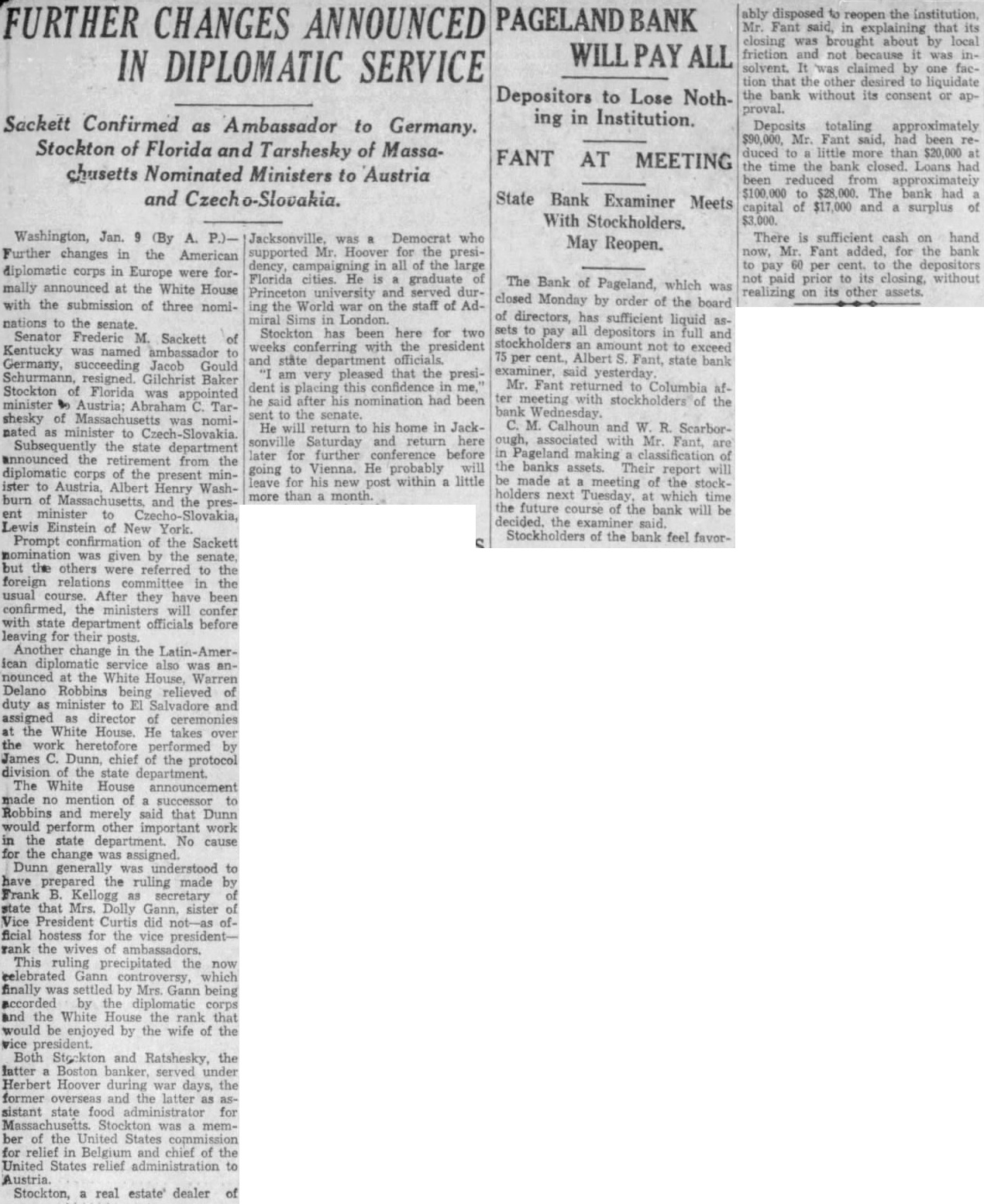 PAGELAND BANK FURTHER CHANGES ANNOUNCED ALL IN DIPLOMATIC SERVICE Sackett Confirmed as Ambassador to Germany. Stockton of Florida and Tarshesky of Massachusetts Nominated Ministers to Austria and Czecho-Slovakia. Washington, Jan. 9 (By A. Further changes in the American diplomatic corps in Europe were formally announced at the White House with the submission of three nominations to the senate Senator Frederic M. Sackett of Kentucky was named ambassador to Germany, succeeding Jacob Gould Schurmann, resigned. Gilchrist Baker Stockton of Florida was appointed minister % Austria; Abraham C. Tarshesky of Massachusetts was nominated as minister to Czech-Slovakia. Subsequently the state department announced the from the diplomatic corps of the present minister to Austria, Albert Henry Washburn of Massachusetts, and the present minister to Czecho- Slovakia, Lewis Einstein of New York. Prompt confirmation of the Sackett nomination was given by the senate, but the others were referred to the foreign relations committee in the usual course. After they have been confirmed, the ministers will confer with state department officials before leaving for their posts. Another change in the Latin-American service also was announced at the White House, Warren Delano Robbins being relieved of duty as minister to El Salvadore and assigned as director of at the White House. He takes over the work heretofore performed by James C. Dunn, chief of the protocol division of the state department. The White House announcement made no mention of successor to Robbins and merely said that Dunn would perform other important work in the state department. No cause for the change was assigned. Dunn generally was understood to have prepared the ruling made Frank B. Kellogg as secretary state that Mrs. Dolly Gann, sister Vice President Curtis did not-as official hostess for the vice presidentrank the wives of This ruling precipitated the now celebrated Gann controversy, which finally was settled by Mrs. Gann being accorded by the diplomatic corps and the White House the rank that would be enjoyed by the wife of the vice Both Stockton and Ratshesky, the latter Boston banker served under Herbert Hoover during war days, the former overseas and the latter as assistant state food administrator for Massachusetts. Stockton was member of the United States commission for relief in Belgium and chief of the United States relief administration to Austria. Stockton, real estate' dealer of Jacksonville, was Democrat who supported Mr. Hoover for the presidency, in all of the large Florida cities. He is graduate of Princeton university and served during the World war on the staff of Admiral Sims in London. Stockton has been here for two weeks conferring with the president and state department officials. am very pleased that the president is placing this confidence in me, he said after his nomination had been sent to the senate. He will return to his home in Jacksonville Saturday and return here later for further conference before going to Vienna. He probably will leave for his new post within a little more than month. Depositors to Lose Nothing in Institution. FANT AT MEETING State Bank Examiner Meets With Stockholders. May Reopen. The Bank of Pageland, which was closed Monday by order of the board of directors, has sufficient liquid assets to pay all depositors in full and stockholders an amount not to exceed 75 per cent., Albert S. Fant, state bank said yesterday Mr. Fant returned to Columbia after meeting with stockholders of the bank Wednesday. C. M. Calhoun and W R. Scarborough, associated with Mr. Fant, are in Pageland making classification of the banks assets. Their report will be made at meeting of the stockholders next Tuesday, at which time the future course of the bank will be decided. the examiner said Stockholders of the bank feel favor- ably disposed to reopen the institution Mr. Fant said, in explaining that its closing was brought about by local friction and not because it was solvent. It was claimed by one faction that the other desired to liquidate the bank without its consent or approval. Deposits totaling approximately $90,000, Mr. Fant said, had been reduced to little more than $20,000 the time the bank closed. Loans had been from $100,000 to $28,000. The bank had capital of $17,000 and a surplus of $3,000. There is sufficient cash on hand now, Mr. Fant added, for the bank to pay 60 per cent. to the depositors not paid prior to its closing, without realizing on its other assets.
