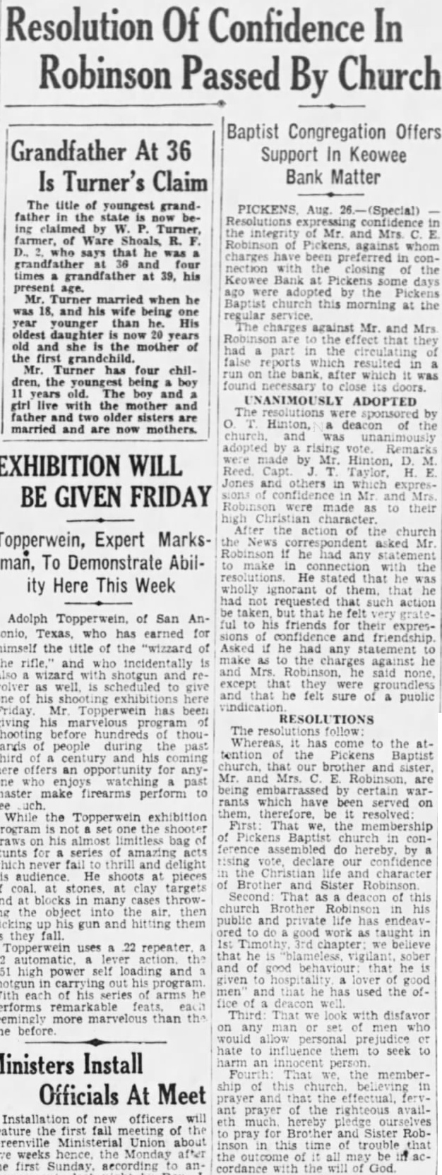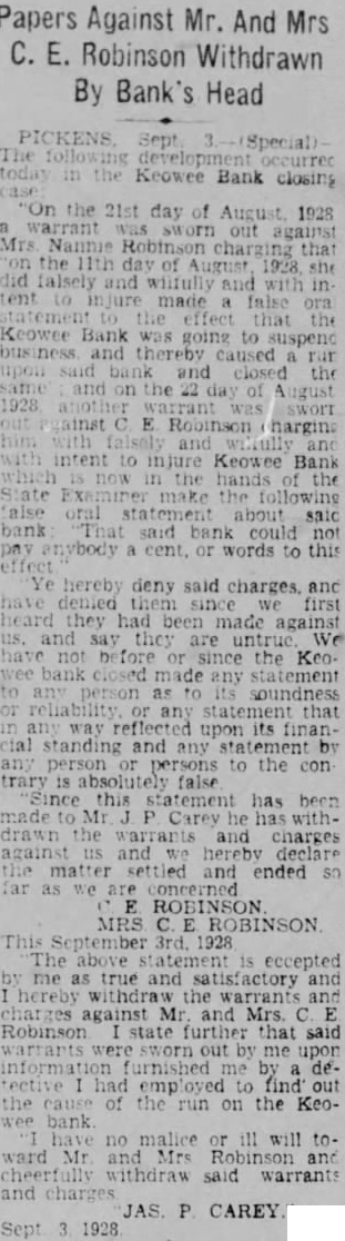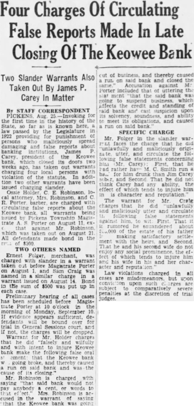 Four Charges Of Circulating False Reports Made In Late Closing Of The Keowee Bank Two Slander Warrants Also Taken Out By James P. Carey In Matter By STAFF CORRESPONDENT PICKENS, Aug Invoking for the first time in the history of the State, so far is known here, law passed by the Legislature 1922 providing for punishment of persons who maliciously spread damaging and false reports about banking institutions, James president of the Keowee bank. which closed its doors two weeks ago, has taken out warrants charging four local persons with violation of the statute. In addition two other warrants have been issued charging slander Ossie Holder, Robinson. 10cal attorney Mrs. Robinson and C. Porter barber are charged with circulating false reports about the Keowee all warrants being issued by Pickens Township Magistrate Porter on August exagainst Mr which taken on August All made bond in the TWO OTHERS NAMED Ernest Folger merchant, was charged in warrant taken out before Magistrate Porter on August and Craig was named in similar charge warrant issued August Bond in the sum of $500 was put up in each Preliminary hearing of all cases has been before Magistrate Porter at o'clock in the morning of Monday, September 10. evidence appears sufficient, defendants bound over for trial in General Sessions court, and if not. the charges will be dropped. Warrant for Holder charges that he did 'falsely and wilfully and with intent to injure Keowee bank make the following false oral ement the Keowee bank going and thereby caused run on said bank and was the cause Mr Robinson charged with saying "that said bank would not pay anybody cent. or words to that Mrs. Robinson cused in the warrant of saving that the Keowee bank was going cut of business, and thereby caused run on said bank and closed the same. Accusation against M: Porter included that of uttering the stat ment "that the said bank was going to suspend which affects the credit and standing of said bank and cast suspicion upon its solvency soundness, and ability to meet its obligations, and caused a run SPECIFIC CHARGE Mr. Folger in the slander warfaces the charge that he and origiutter, and circulate the folfalse him Mr Carey) First, that he ad rather M. Smith run ba.. for him drunk than Jim Carey sober, and Second That he did not think Carey had any ability. the effect of which tends to injure him in character and reputation The warrant for Mr Craig charges that did unlawfully and maliciously utter and circulate following false against him, wit First That he about of the estate of his father making satisfactory settlement with the heirs. and Second That he and his second wife do not enjoy any social prominence, the ef fect of which tends to injure him and his wife in his and her character and reputa Law violations charged in all cases are but upon convic upon such rges are subject comparatively penalties at the discretion of trial judges.