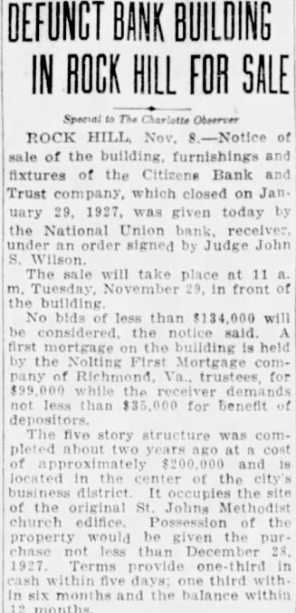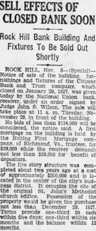 ROCK HILL. Nov. -(Special) Notice of sale of the building. furnishings and fixtures of the Citizens Bank and Trust company which closed on January 29, 1927, was given today by the National Union bank, receiver, under an order signed by Judge John S. Wilson. The sale will take place at 11 m. Tuesday, November 29, in front of the building. No bids less than $134 000 will be considered, the notice said. A first mortgage on the building is held by the Nolting First Mortgage company. of Richmond, Va., trustees, for $99,000 while the receiver demands not less than $35,000 for benefit of depositors. The five story structure was completed about two years ago at cost of approximately and is located in the center of the city's business district. It occupies the site of the original St. John's Methodist church edifice. Possession of the property would be given the not less than December 28. 1927 Terms provide one-third in cash within five days: one-third within six months and the balance within 12 months.