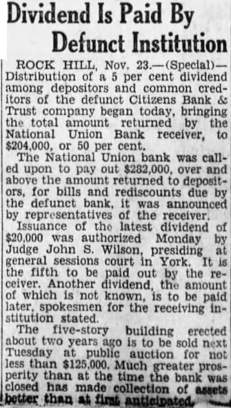 ROCK Nov. of cent dividend among and common creditors the defunct Citizens Bank Trust company began today, bringing total amount returned the National Union Bank receiver, $204,000, or 50 The Union bank was callupon to pay out returned for bills and rediscounts due defunct bank, announced the receiver. Issuance of the latest dividend was authorized Monday Judge John Wilson, presiding sessions York. fifth the rethe amount which is not for the receiving institution stated The five-story building erected about two years sold next Tuesday public auction for than $125,000. Much greater than the time the bank collection than