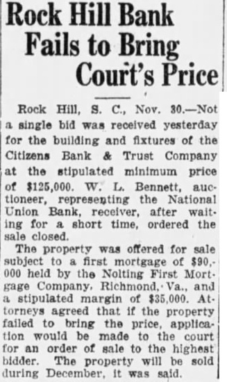 Rock Hill, C., single bid was received yesterday for the building and fixtures of the Citizens Bank & Trust Company at the stipulated minimum price of $125,000. L. Bennett, tioneer, representing the National Union Bank, after for short time, ordered the sale closed. The property was offered for sale subject to first mortgage of $90, 000 held by the Nolting First Mort gage and a stipulated margin torneys agreed that the property failed to bring the tion would be made to the for an order of sale to the bidder The property will be sold during December, was said