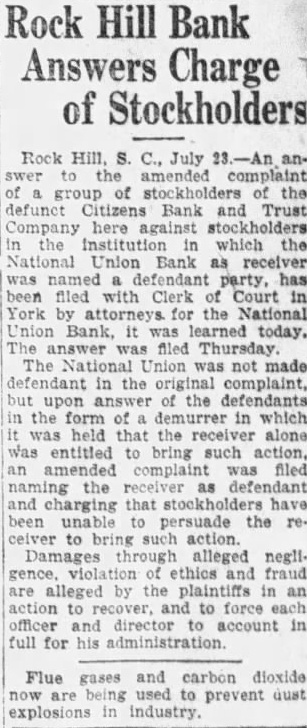 Rock Hill S. C., July the amended group of stockholders the defunct Citizens Bank and Trust Company here in which the National Bank as receiver was named defendant party, has been filed with Clerk Court in York by attorneys for the National Union Bank, it was learned today. The answer was filed Thursday The Union was not made in the complaint, but the defendants in the form of demurrer in which was held that the alone was entitled to bring such action, an amended complaint was filed naming receiver defendant and charging that stockholders have been unable persuade the ceiver to action. Damages alleged negliof ethics fraud are alleged by the plaintiffs in action to recover, and to force each officer and director to account in full for his administration