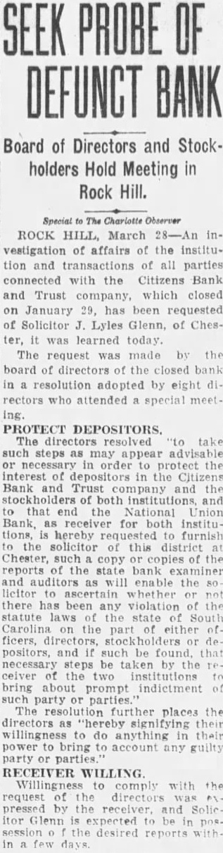 Special The Charlotte Observer ROCK HILL, March 28-An investigation of affairs of the Institution and transactions of all parties connected with the Citizens Bank and Trust company, which closed on January 29, has been requested of Solicitor J. Lyles Glenn, of Chester, it was learned today. The request was made by the board of directors of the closed bank in a resolution adopted by eight directors who attended a special meetIng. PROTECT DEPOSITORS. The directors resolved "to take such steps as may appear advisable or necessary order to protect the interest depositors in the Citizens Bank and Trust company and the stockholders of both institutions, and to that end the National Union Bank, as receiver for both institutions, is hereby requested to furnish to the solicitor of this district at Chester, such copy or copies of the reports of the state bank and auditors as will enable the 80licitor to ascertain whether or not there has been any violation of the statute laws of the state of South Carolina on the part of either officers, or depositors, and such be found. that necessary steps be taken the receiver of the two institutions to bring about prompt indictment of such party or parties.' The resolution further places the directors as "hereby signifying their willingness to do anything in their power to bring to account any guilty party or parties.' RECEIVER WILLING. Willingness comply with the request the directors AV. pressed the receiver, and Solicftor Glenn is expected to be in possession the desired reports within few days.