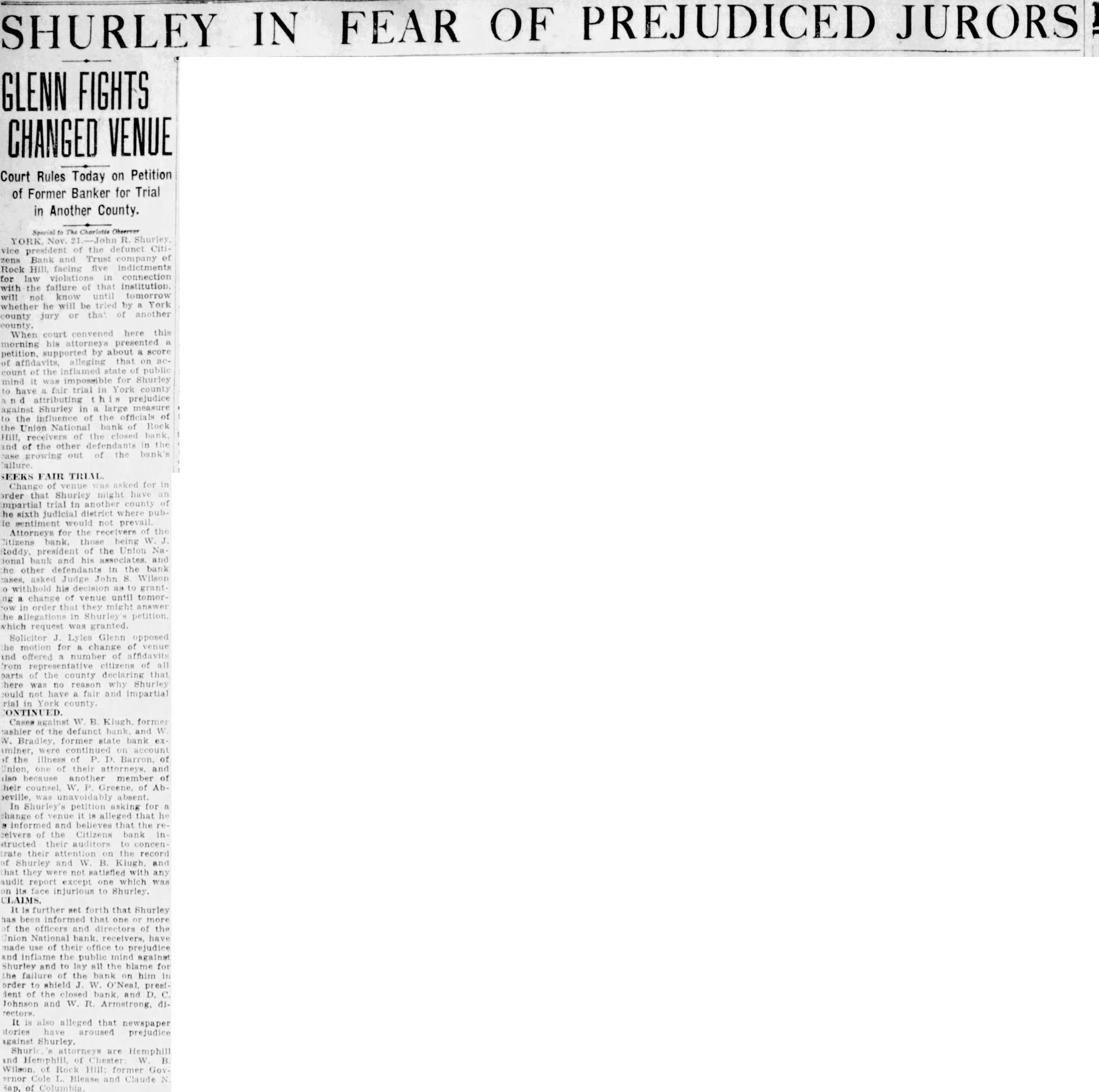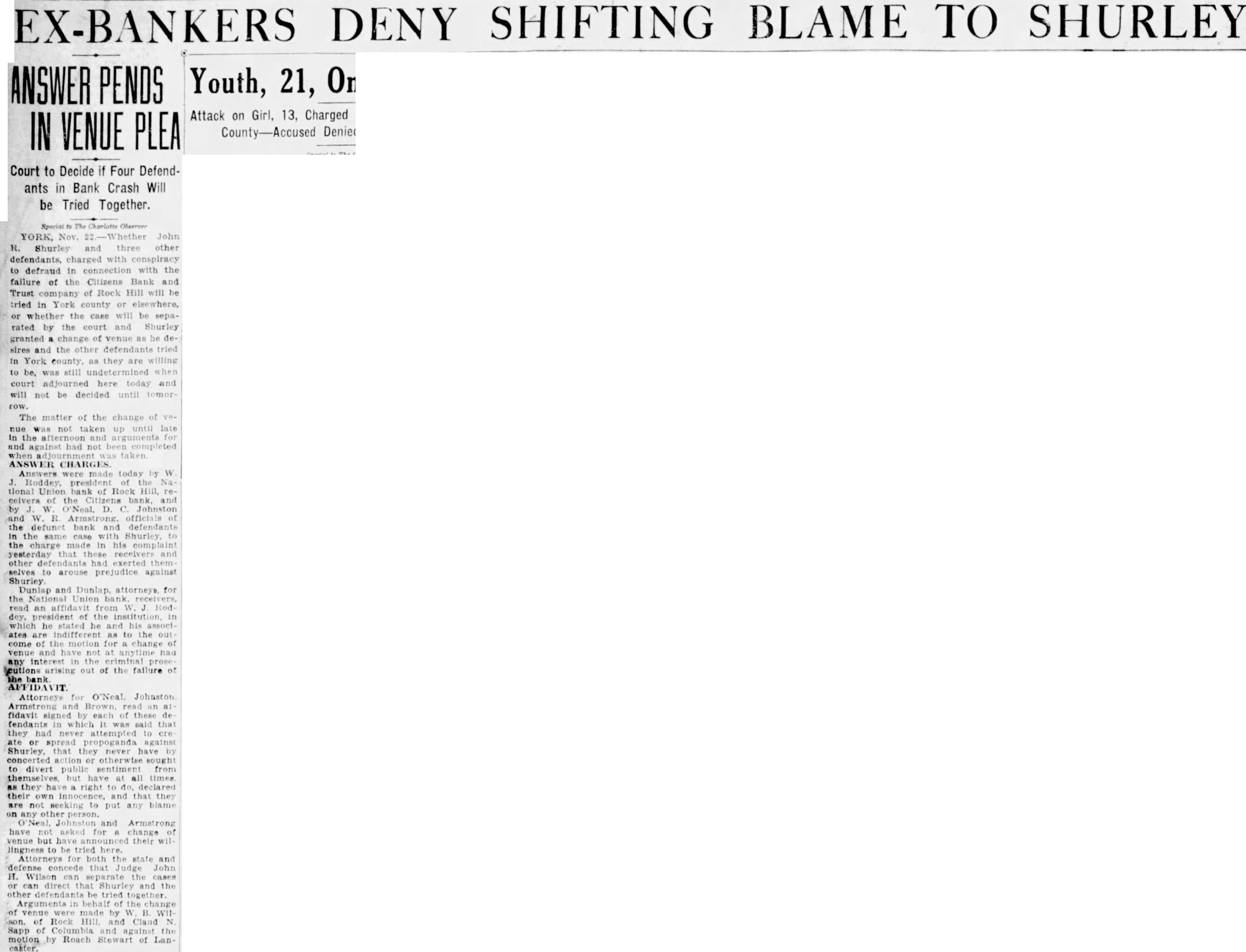The Charlotte YORK, Nov. John R. Shurley and three other defendants, with conspiracy to defraud in connection with the failure of the Citizens Bank and Trust company of Rock Hill will be tried in York county or or whether the case be separated by the court and Shurley granted change of venue as he desires and the other defendants tried in York county, as they are willing to be, still undetermined when court here today and will not be decided until The matter of the change of nue was not taken up until late in the afternoon arguments and against had not been completed taken ANSWER CHARGES. Answers made today by W J. Roddey, president the tional Union bank of Rock Hill, ceivers of the Citizens and by O'Neal. D. Johnston and W. R. Armstrong. officials of the defunct bank and defendants in the case with Shurley, the charge in his yesterday that receivers and other defendants had exerted them selves to arouse prejudice against Shurley Dunlap and Dunlap. attorneys. for the National read an from W. Roddey, president of the in which he stated he and his ates are indifferent as to the out come of the motion for change of venue and anytime had any interest the criminal cutions arising out of the failure of the bank Attorneys O'Neal Johnston fidavit signed by each of these de fendants in which was said that they had attempted ate or spread propoganda against Shurley, that they never have by concerted otherwise to divert public sentiment from themselves but all times they right their innocence, and that they are not seeking to put any blame on any other person. Johnston and Armstrong have not asked for change venue but their willingness tried Attorneys for both the state and defense that Judge John H. Wilson can separate the cases or can direct that Shurley and the other defendants be tried together Arguments in behalf the change of venue were made by WIIson, of Rock Hill, and Claud Sapp of Columbia and the motion by Roach Stewart of Lancaster.