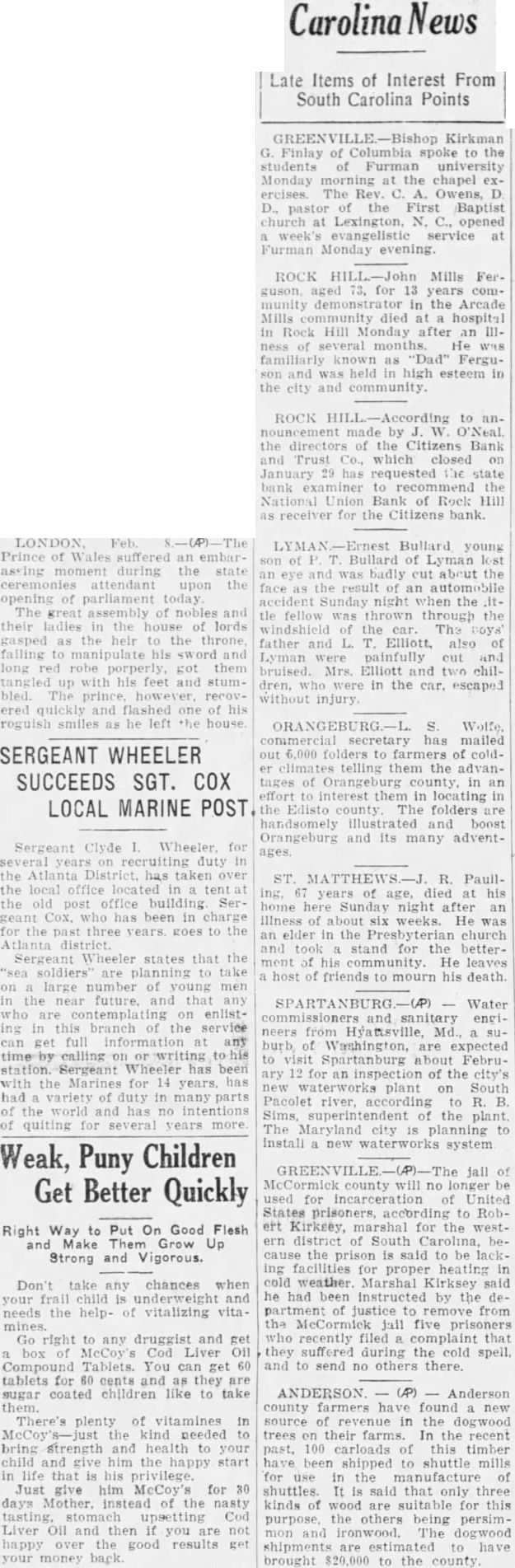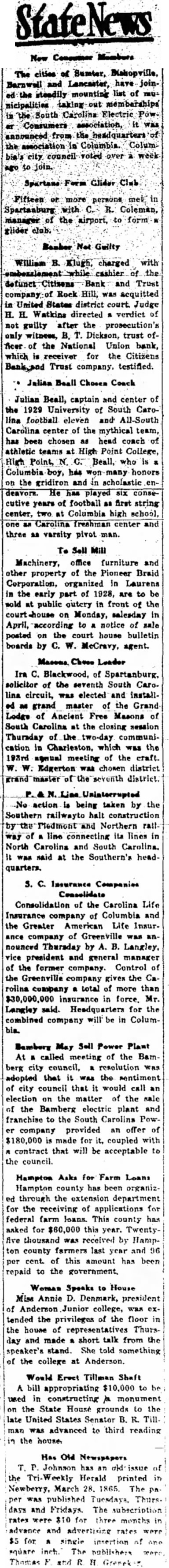 ST. MATTHEWS.-J. R. Paulling. 67 years of age, died at his home Sunday night after an illness of about six weeks. He was an elder in the church and took stand for the betterment of his community He leaves a host of friends to mourn his death. commissioners and sanitary engineers from Hyattsville, Md., suburb of Washington, are expected to visit Spartanburg about February 12 for an inspection of the city's new waterworks plant on South Pacolet river. according to R. B. Sims, superintendent of the plant. The Maryland city is planning to install a new waterworks system jall of McCormick county will no longer be used for incarceration of United States prisoners, according to Robert Kirksey, marshal for the western district of South Carolina, because the prison is said to be lack. ing facilities for proper heating in cold weather Marshal Kirksey said he had been instructed by the department of justice to from the McCormick jall five prisoners who recently filed that they suffered during the cold spell, and to send no others there.
