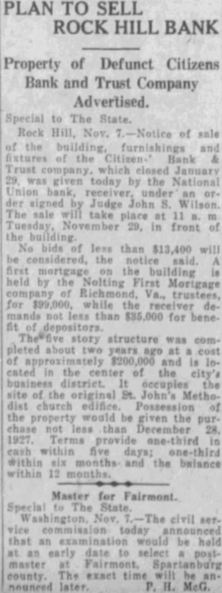 Property of Defunct Citizens Bank and Trust Company Advertised. Special to The State. Rock Hill, Nov. Notice of sale building, furnishings January by the National signed Judge The sale take place Tuesday, 29, front the building. No less than $13,400 will the first mortgage by the Nolting Mortgage Va., trustees, for $99,000, while the receiver demands not less for bene. structure was completed two $200,000 and cated the of the city's occupies site original St. John's dist church edifice Possession the be given the chase December Terms within five days; one-third within six months and the bulance within 12 months.