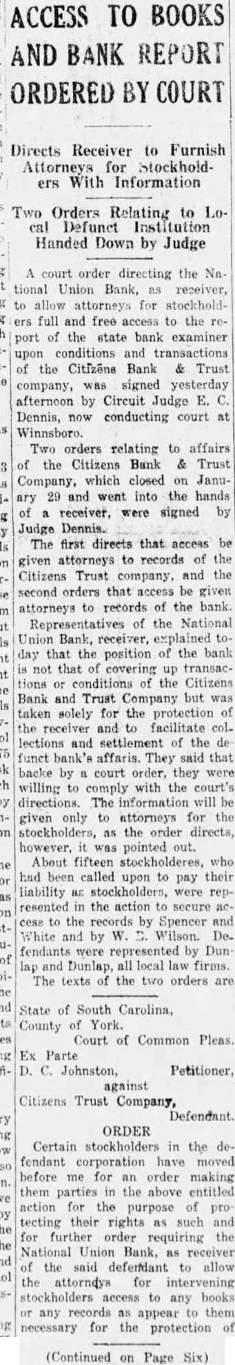Two Orders Relating to Local Defunct Institution Handed Down by Judge court order directing the tional Union Bank, as receiver, allow attorneys for stockholdfull and free access to the port of the state bank examiner upon conditions and transactions of the Citizens Bank Trust company, was signed yesterday afternoon by Circuit Judge E. Dennis, now conducting court at Winnsboro. Two orders relating to affairs of the Citizens Bank & Trust Company, which closed on Janu29 and went into the hands ary of receiver, were signed Judge Dennis. The first directs that access given attorneys to records of the Citizens Trust company, and the second orders that access be given to records of the bank. attorneys Representatives of the National Union Bank, receiver, explained today that the position of the bank not that of covering up transactions or conditions of the Citizens Bank and Trust Company but was taken solely for the protection the receiver and to facilitate collections and settlement of the funct affaris. They said that backe court order, they were willing to comply with the court's directions. The information will be given only to attorneys for the stockholders, as the order directs, however, was pointed out. About fifteen stockholderes, who had been called upon to pay their liability stockholders, were resented the action to secure cess to the records by Spencer and White and by Wilson. fendants were represented by Dun all local law firms. The texts of the two orders are