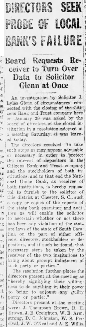 An investigation by Solicitor Lyles Glenn of circumstances connected with the closing of the Citizens Bank and Trust company here January 29 was asked by the beard of of the closed in stitution in resolution adopted at meeting Saturday, it was learnThe directors resolved "to take such may appear advisable necessary in order to protect the interest of depositors in the Citizens Bank and Trust mpany and the stockholders of both in stitutions, and to that end the National Union Bank, as receiver of both institutions, is hereby reques ttd to furnish to the solicitor this district at Chester, such copy or copies of the reports of the state bank examiner and audi as will enable the solicitor whether or not there has been any violation of the statlaws of the state South Caro lina on the part of either offidirectors, stockholders or depositors, and if such be found, that necessary steps be taken by the receiver of the two institutions about prompt indictment of party parties." The resolution further places the directors present at the meeting as "hereby signifying their willing ness to do anything in their power to bring to jount any party or partics." Directors present at the meeting were: J. Thompson Brown, D. Brown, Creighton, R Armstrong, Johnston, W. Per cival, W. O'Neal and Willis.