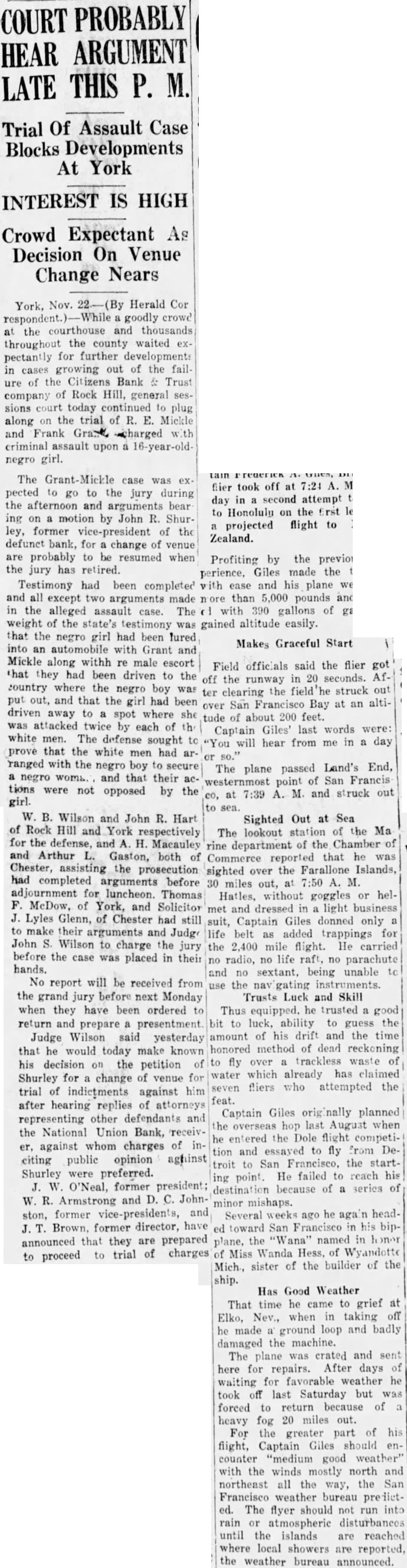 Nov. Herald Cor York, goodly crowd at the courthouse and thousands the county waited throughout pectantly for further developments in cases growing out of the failure of the Citizens Bank Trust company of Rock Hill, general sions court today continued to plug along the trial of E. Mickle and Frank charged criminal assault upon negro girl.