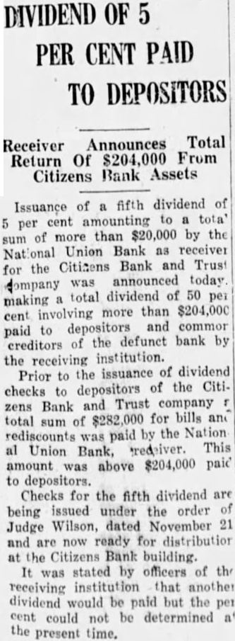Announces Total Receiver Of $204,000 From Return Citizens Bank Assets fifth dividend of Issuance of amounting to tota' per cent than $20,000 by the of more Union Bank as receiver National Citizens Bank and Trust for the was announced today company total dividend of 50 making more than $204,000 cent involving depositors and commor paid to the defunct bank by creditors the institution. receiving Prior to the issuance of dividend of the Citichecks depositors zens Bank and Trust company for bills total sum of $282,000 the Nation rediscounts was by redeiver. This Union Bank, $204,000 paid amount was above to depositors. Checks for the fifth dividend being issued under the order of Judge Wilson, dated November 21 and are now ready for distribution the Citizens Bank building. was stated by officers of the receiving institution that another dividend would be paid but the per cent could not be determined the present time.