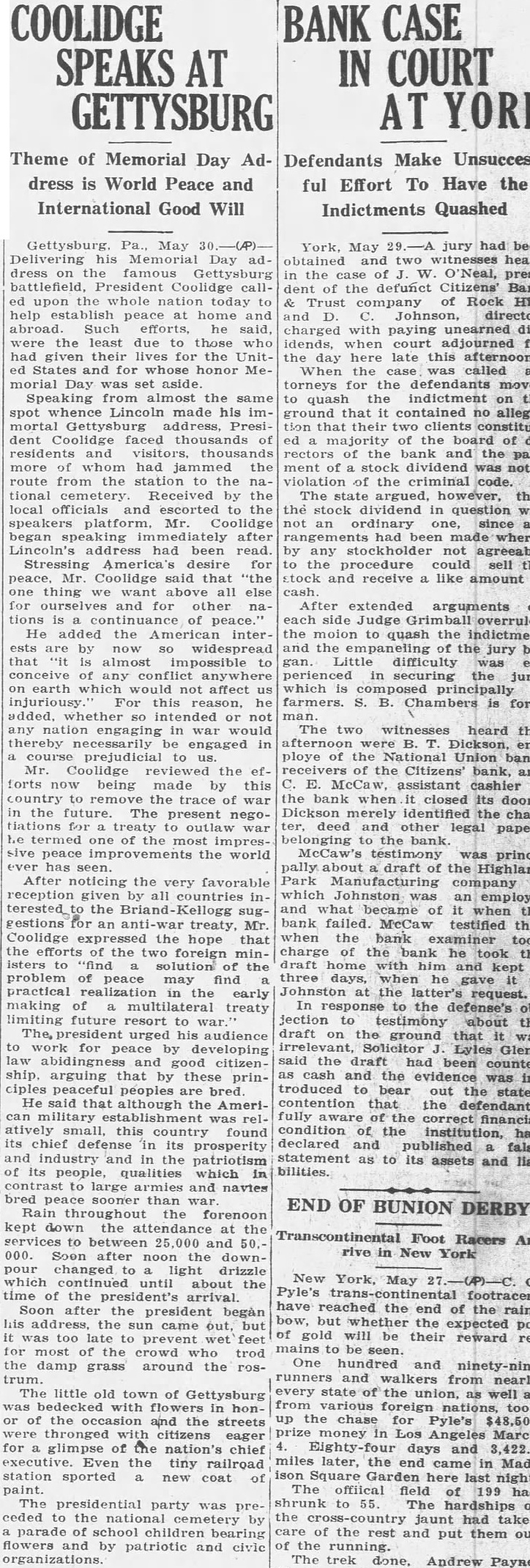 Gettysburg. May York, May Delivering Memorial Day ad- obtained and two witnesses heard dress famous Gettysburg the case presibattlefield, President Coolidge dent the defunct Citizens' Bank upon whole today to Trust Rock company help establish peace home Johnson, abroad. Such efforts, he said, charged with paying unearned least due those idends, when court adjourned for had given their the Unit- the late afternoon for whose honor Me- When called morial Day was aside. torneys the defendants moved Speaking from almost the quash indictment on spot whence Lincoln made his ground that contained no allegamortal Gettysburg Presi- tion their two clients dent Coolidge thousands majority of the board of residents and rectors bank and the paymore whom had jammed the ment of stock dividend was not route from the station na- violation the criminal code. tional cemetery. Received by the The state argued, however, that local escorted the stock dividend question speakers platform. Coolidge not an ordinary one, began speaking after been made whereLincoln's address had been read. by any stockholder not agreeable Stressing America's desire for the procedure could Coolidge said that stock and receive like amount in thing above all cash other After extended arguments on tions peace. each side Judge Grimball overruled added the inter- the moion quash the indictment the the jury bealmost impossible Little difficulty conceive perienced securing earth which would affect which composed injuriousy farmers. Chambers is foreadded, whether intended not man engaging would The witnesses heard this thereby engaged afternoon Dickson, course prejudicial ploye National Union bank Coolidge the of Citizens bank, and now being made by this McCaw, assistant cashier country the trace of war bank when closed its doors. the future. The present nego. Dickson merely identified chartreaty deed and other legal papers termed the most impres- belonging bank peace the world McCaw's testimony was princiseen draft the Highland noticing very favorable Park company reception given which Johnston was employe, the what became of when the gestions an treaty, Mr bank failed. McCaw testified that Coolidge the hope that when the bank examiner took the efforts the foreign charge the bank he took the "find the home with him and kept problem peace find three days, when may gave practical realization Johnston the latter's early request. multilateral treaty In to the defense's future resort to jection testimony about the urged his audience draft the ground that work peace by developing Solicitor Glenn good the draft had been citizen- counted arguing that these cash and the evidence was inprinpeaceful peoples bred. troduced to bear state's He said although Ameri- contention that the defendants military was fully the atively country found condition of the institution, had its chief defense its declared and published false prosperity industry the patriotism statement as to its assets and its people, qualities which bilities. large armies and than END OF BUNION DERBY Rain throughout forenoon kept down attendance at the Transcontinental Foot Racers and 000. in New York Soon after noon downpour changed light drizzle New York, May until about the time of the president's footracers Soon reached the end of the president began his came out, but whether the expected pot too of gold will be their late feet reward most mains be seen. the crowd who trod the damp grass the ros- One hundred and trum. runners and walkers from nearly The little old town of Gettysburg state of the as well in hon- from various foreign took or of the and up chase for Pyle's streets citizens eager money in Los Angeles March for glimpse of the nation's chief days and executive. Even the tiny railroad miles later, end came Madstation sported new coat of ison Square Garden here last night paint. The official field had presidential party pre- shrunk The hardships of ceded the cemetery by jaunt had taken parade of children bearing of the rest and them put out flowers and by patriotic and civic the running. The trek done, Andrew Payne,