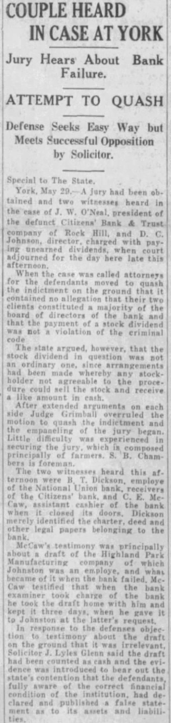 Special to The York May jury had been ob. tained and two heard in the of O'Neal president of the defunct Citizens' Bank & Trust company Rock Hill, and D. Johnson, with paydjourned for the day here late this afternoon. the case was called attorneys for the defendants moved to quash the the ground that no two clients of the board directors of the and that the dividend was not violation of the criminal argued, however, that the question any stock the proce and receive After each Judge overruled the quash the indictment and the jury difficulty the S. Cham The two heard this employe of the the Citizens bank and the bank the legal papers belonging to the McCaw's about draft the Highland Park which Johnston was Caw when the bank bank him three days. when he gave Johnston at the latter's In response to the defenses about the draft the that irrelevant said the had been counted and the introduced bear out the the fully aware the correct financial condition institution, had clared and published false state. as to its assets and liabili-
