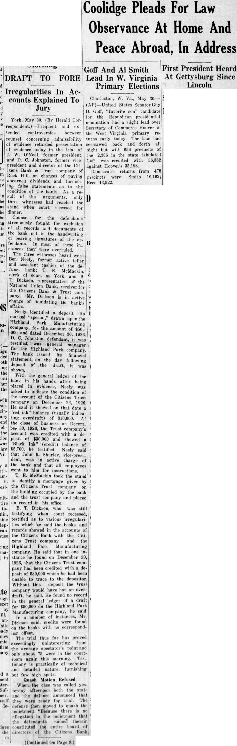York, May (By Herald and tended controversies between counsel concerning admissibility evidence retarded presentation of evidence today in the trial of O'Neal, former president, the and Johnston, former vicepresident and director of the Cit. izens Bank Trust of company Rock Hill, on charges of paying unearned dividends and furnishfalse statements to the of the bank. sult arguments, only three witnesses had reached the stand when court recessed for dinner. Counsel for the defendants strenuously fought for exclusion all records documents of the bank in the handwriting bearing signatures of the fendants. In most of these stances they were overruled. The three witnesses heard were Ben Neely, former active teller and assistant cashier of the funct bank; McMackin. clerk of court at York, and Dickson, representative of the National Union Bank, receiver the Citizens Bank Trust company. Mr. Dickson in active charge of liquidating the bank's affairs. Neely identified deposit slip marked "special," drawn Highland Park Manufacturing company, for the amount of 000 and dated December 30, 1926. Johnston, defendant, general manager Highland Park company. bank issued its financial statement the day following of the draft, With the general ledger of the in his hands after being Neely was asked indicate the condition of the account of the Citizens Trust December 26, 1926. showed that date on balance (usually indicaoverdraft) of $10,000. At close business 1926, the Trust company's was credited with $30,000 showed Ink" (credit) balance he testified. Neely said John Shurley, vice-presi_ was active charge of bank and that all employees to him for instructions. McMackin took the stand identify mortgage given Citizens Trust company the occupied by the bank trust company and placed record his office. Dickson, who was still testifying when court recessed, to various irregulariwhich he said the books and records showed in the accounts the Citizens Bank with the CitiTrust and the company Highland Park Manufacturing company. He said that in one he found on December 1926, that the Citizens Trust pany had been credited with posit of which he had been to trace to the depositor. this deposit the trust company would have had an overhe said. He found no record ledger of draft general the Highland Park $50,000 on Manufacturing company, he said. number of instances, Mr. Dickson said, credits were found books with no correspondoffset. trial thus far has proved uninteresting from exceedingly spectator's average about 75 the courtagain this morning. timony practically of technical detailed nature, furnishing few high spots. Quash Motion Refused case was called afternoon both the state the defense that were ready for trial. The then moved to quash the "Because there indictment the indictment that allegation defendants named therein constituted the entire board directors the Citizens Bank