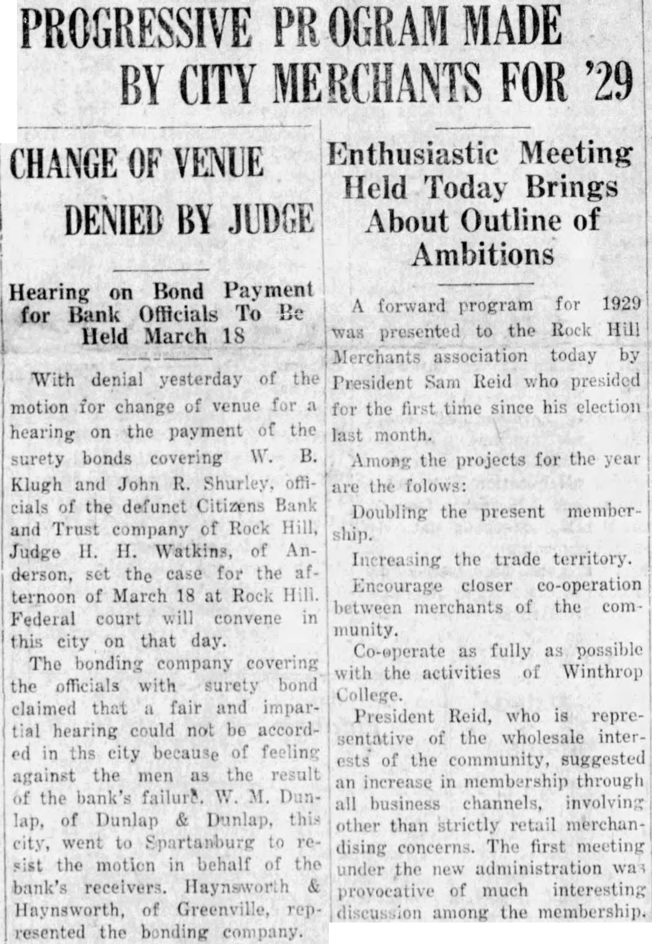 Enthusiastic Meeting Held Today Brings About Outline of Ambitions forward program for 1929 presented to the Rock Hill Merchants association today President Sam Reid who presided the first time since his election month.