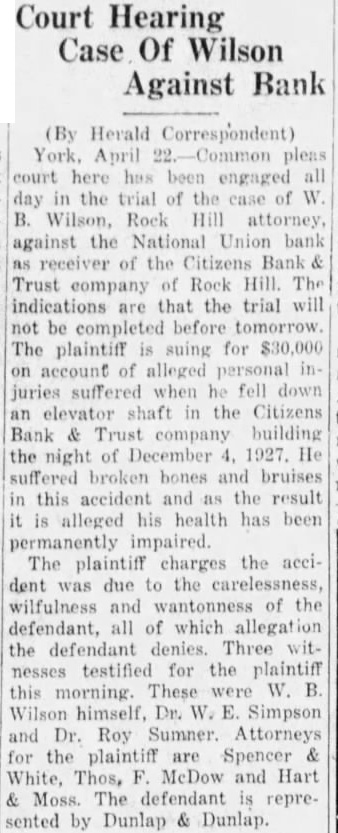 (By Herald Correspondent) York, April 22.-Common pleas court here has been engaged all day in the trial of the case of W. B. Wilson, Rock Hill attorney, against the National Union bank as receiver of the Citizens Bank & Trust company of Rock Hill. The indications are that the trial will not be completed before tomorrow. The plaintiff is suing for $30,000 on account of alleged personal injuries suffered when he fell down an elevator shaft in the Citizens Bank & Trust company building the night of December 4. 1927. He suffered broken bones and bruises in this accident and as the result it is alleged his health has been permanently impaired. The plaintiff charges the accident was due to the carelessness, wilfulness and wantonness of the defendant, all of which allegation the defendant denies. Three witnesses testified for the plaintiff this morning. These were W. B. Wilson himself, Dr. W. E. Simpson and Dr. Roy Sumner Attorneys for the plaintiff are Spencer & White, Thos, F. McDow and Hart & Moss. The defendant is represented by Dunlap & Dunlap.