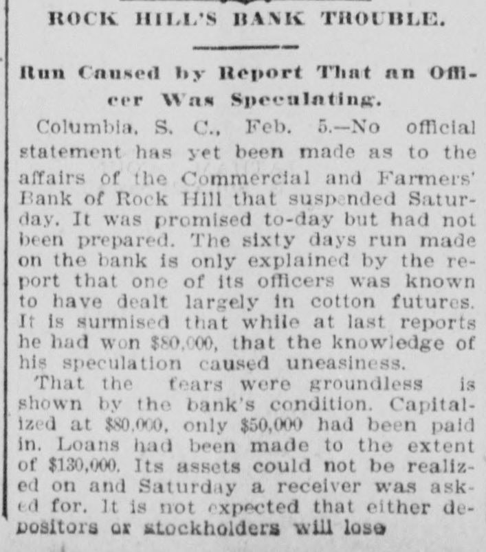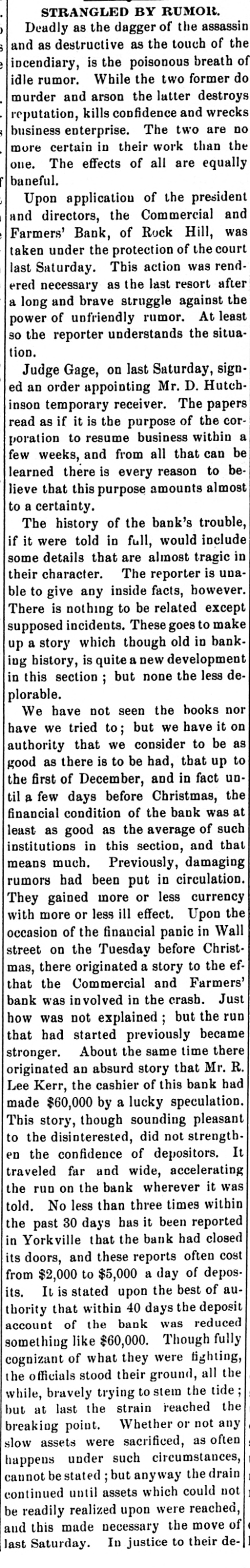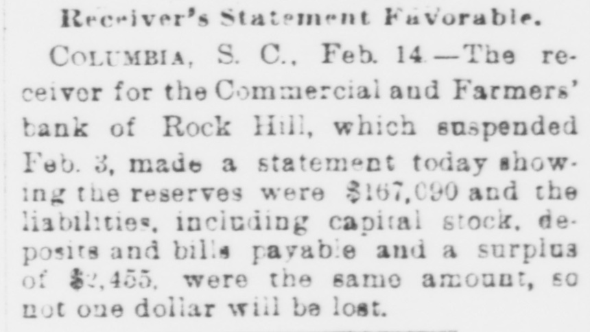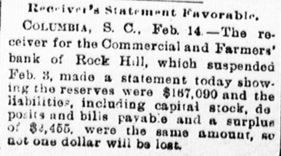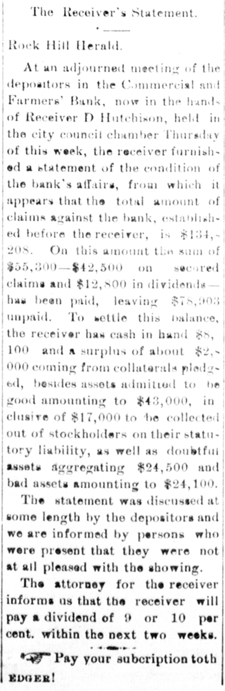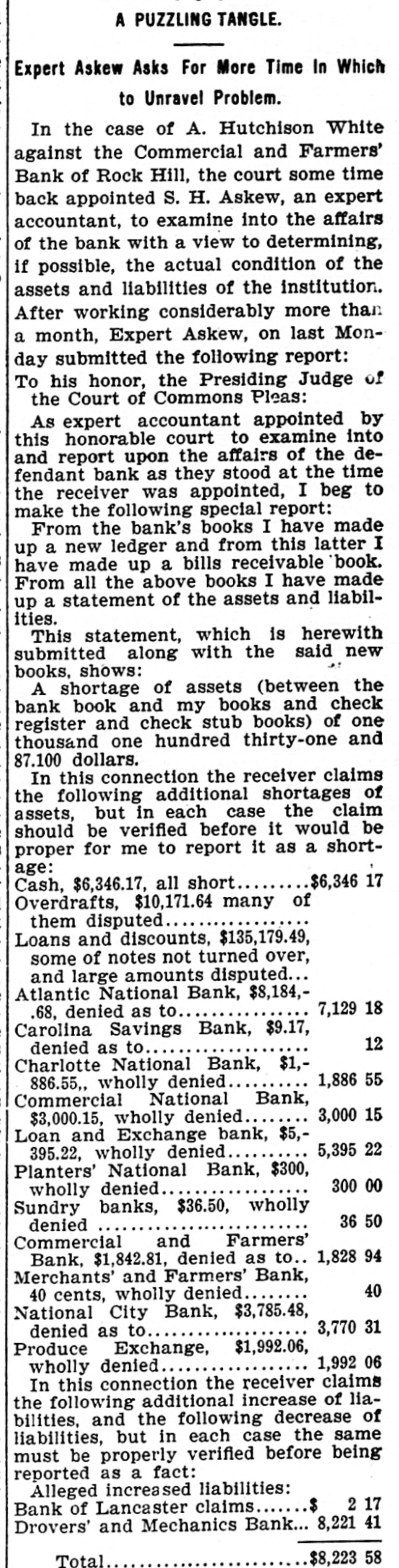 A PUZZLING TANGLE. Expert Askew Asks For More Time In Which to Unravel Problem. In the case of A. Hutchison White against the Commercial and Farmers' Bank of Rock Hill, the court some time back appointed S. H. Askew, an expert accountant, to examine into the affairs of the bank with a view to determining, if possible, the actual condition of the assets and liabilities of the institution. After working considerably more than a month, Expert Askew, on last Monday submitted the following report: To his honor, the Presiding Judge of the Court of Commons Pleas: As expert accountant appointed by this honorable court to examine into and report upon the affairs of the defendant bank as they stood at the time the receiver was appointed, I beg to make the following special report: From the bank's books I have made a new I a bills up have made ledger up and from receivable this latter book. From all the above books I have made up a statement of the assets and liabilities. This statement, which is herewith submitted along with the said new books, shows: A shortage of assets (between the bank book and my books and check register and check stub books) of one thousand one hundred thirty-one and 87.100 dollars. In this connection the receiver claims the following additional shortages of but in each case assets, the claim should be verified before it would be proper for me to report it as a shortage: $6,346 17 Cash, $6,346.17, all short Overdrafts, $10,171.64 many of them disputed Loans and discounts, $135,179.49, some of notes not turned over, and large amounts disputed Atlantic National Bank, $8,184,7,129 1 18 .68, denied as to Carolina Savings Bank, $9.17, 12 denied as to Charlotte National Bank, $1,1,886 55 886.55,, wholly denied Commercial National Bank, 3,000 15 $3,000.15, wholly denied Loan and Exchange bank, $5,5,395 22 395.22, wholly denied Planters' National Bank, $300, 300 00 wholly denied Sundry banks, $36.50, wholly 36 50 denied Commercial and Farmers' Bank, $1,842.81, denied as to 1,828 94 Merchants' and Farmers' Bank, 40 40 cents, wholly denied National City Bank, $3,785.48, 3,770 31 denied as to Produce Exchange, $1,992.06, wholly denied 1,992 06 In this connection the receiver claims the following additional increase of liabilities, and the following decrease of but in each case same liabilities, verified before the being must be properly reported as a fact: Alleged increased liabilities: 2 17 $ Bank of Lancaster claims 8,221 41 Drovers' and Mechanics Bank $8,223 58 Total.