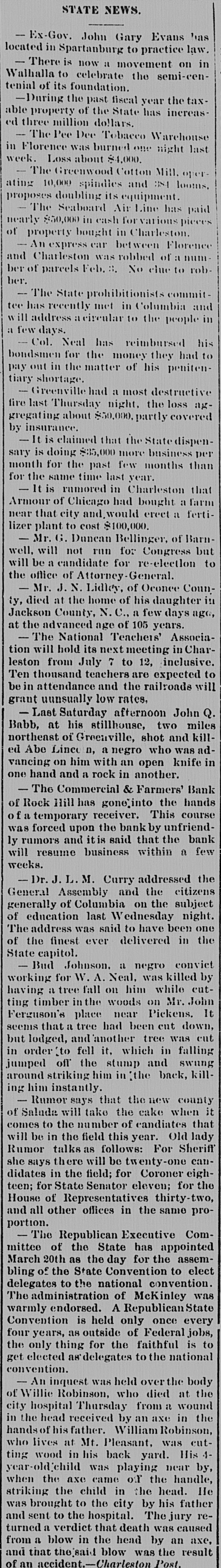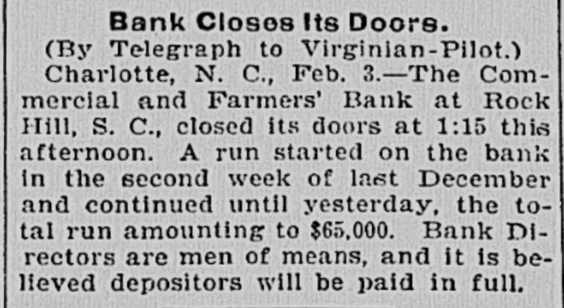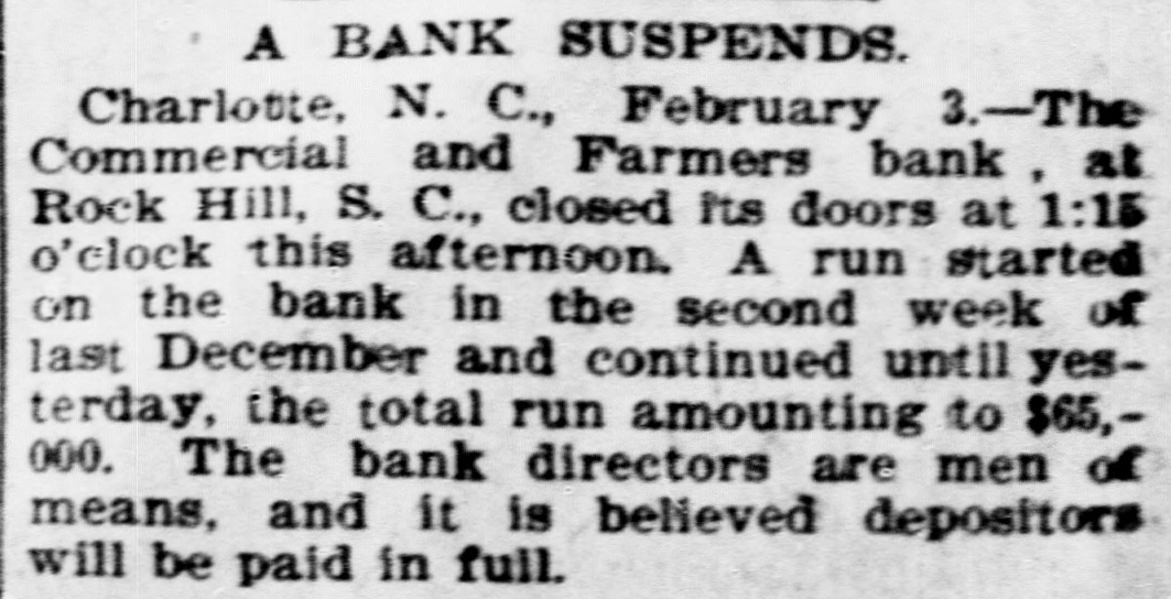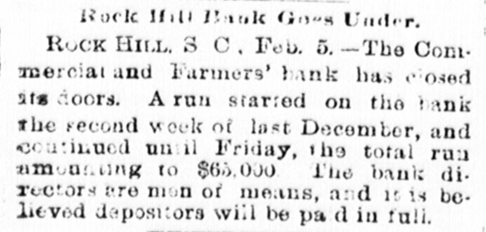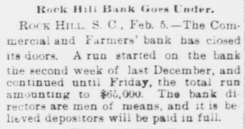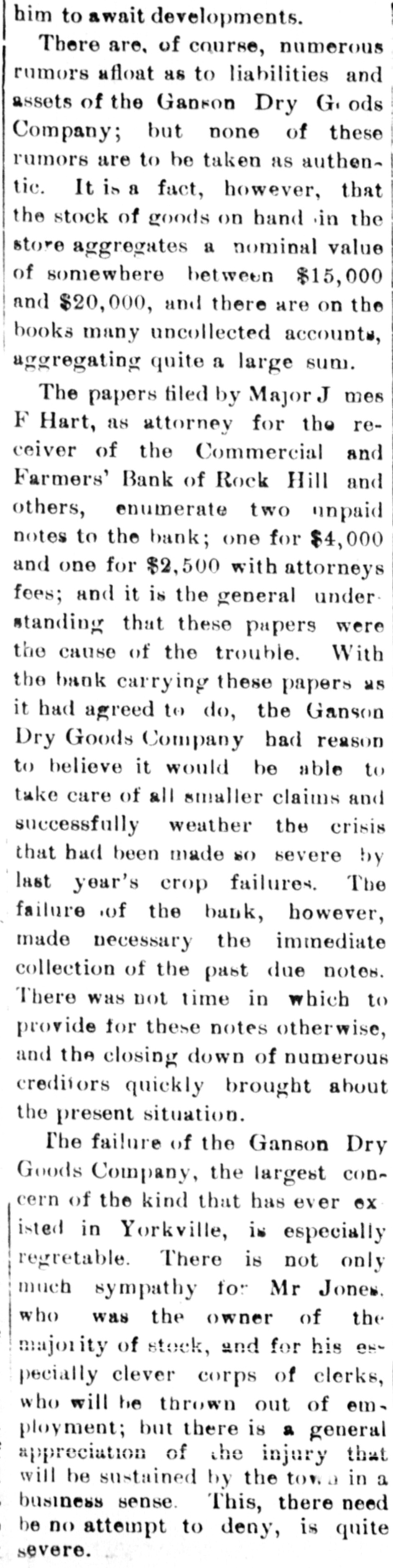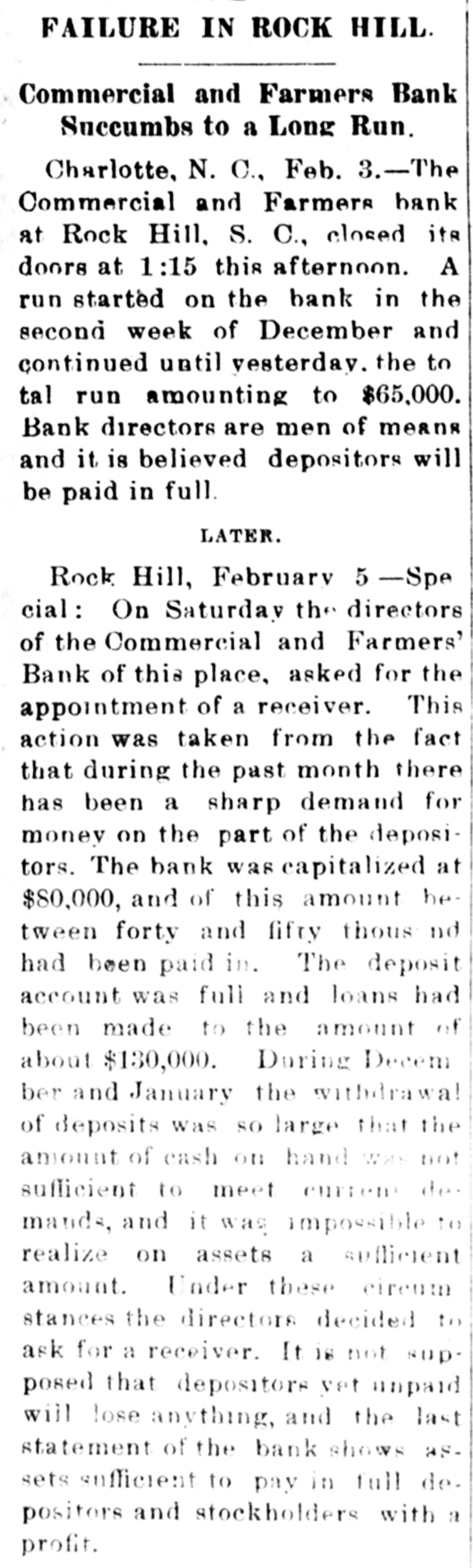 A PUZZLING TANGLE. Expert Askew Asks For More Time In Which to Unravel Problem. In the case of A. Hutchison White against the Commercial and Farmers' Bank of Rock Hill, the court some time back appointed S. H. Askew, an expert accountant, to examine into the affairs of the bank with a view to determining, if possible, the actual condition of the assets and liabilities of the institution. After working considerably more than a month, Expert Askew, on last Monday submitted the following report: To his honor, the Presiding Judge of the Court of Commons Pleas: As expert accountant appointed by this honorable court to examine into and report upon the affairs of the defendant bank as they stood at the time the receiver was appointed, I beg to make the following special report: From the bank's books I have made a new I a bills up have made ledger up and from receivable this latter book. From all the above books I have made up a statement of the assets and liabilities. This statement, which is herewith submitted along with the said new books, shows: A shortage of assets (between the bank book and my books and check register and check stub books) of one thousand one hundred thirty-one and 87.100 dollars. In this connection the receiver claims the following additional shortages of but in each case assets, the claim should be verified before it would be proper for me to report it as a shortage: $6,346 17 Cash, $6,346.17, all short Overdrafts, $10,171.64 many of them disputed Loans and discounts, $135,179.49, some of notes not turned over, and large amounts disputed Atlantic National Bank, $8,184,7,129 1 18 .68, denied as to Carolina Savings Bank, $9.17, 12 denied as to Charlotte National Bank, $1,1,886 55 886.55,, wholly denied Commercial National Bank, 3,000 15 $3,000.15, wholly denied Loan and Exchange bank, $5,5,395 22 395.22, wholly denied Planters' National Bank, $300, 300 00 wholly denied Sundry banks, $36.50, wholly 36 50 denied Commercial and Farmers' Bank, $1,842.81, denied as to 1,828 94 Merchants' and Farmers' Bank, 40 40 cents, wholly denied National City Bank, $3,785.48, 3,770 31 denied as to Produce Exchange, $1,992.06, wholly denied 1,992 06 In this connection the receiver claims the following additional increase of liabilities, and the following decrease of but in each case same liabilities, verified before the being must be properly reported as a fact: Alleged increased liabilities: 2 17 $ Bank of Lancaster claims 8,221 41 Drovers' and Mechanics Bank $8,223 58 Total.