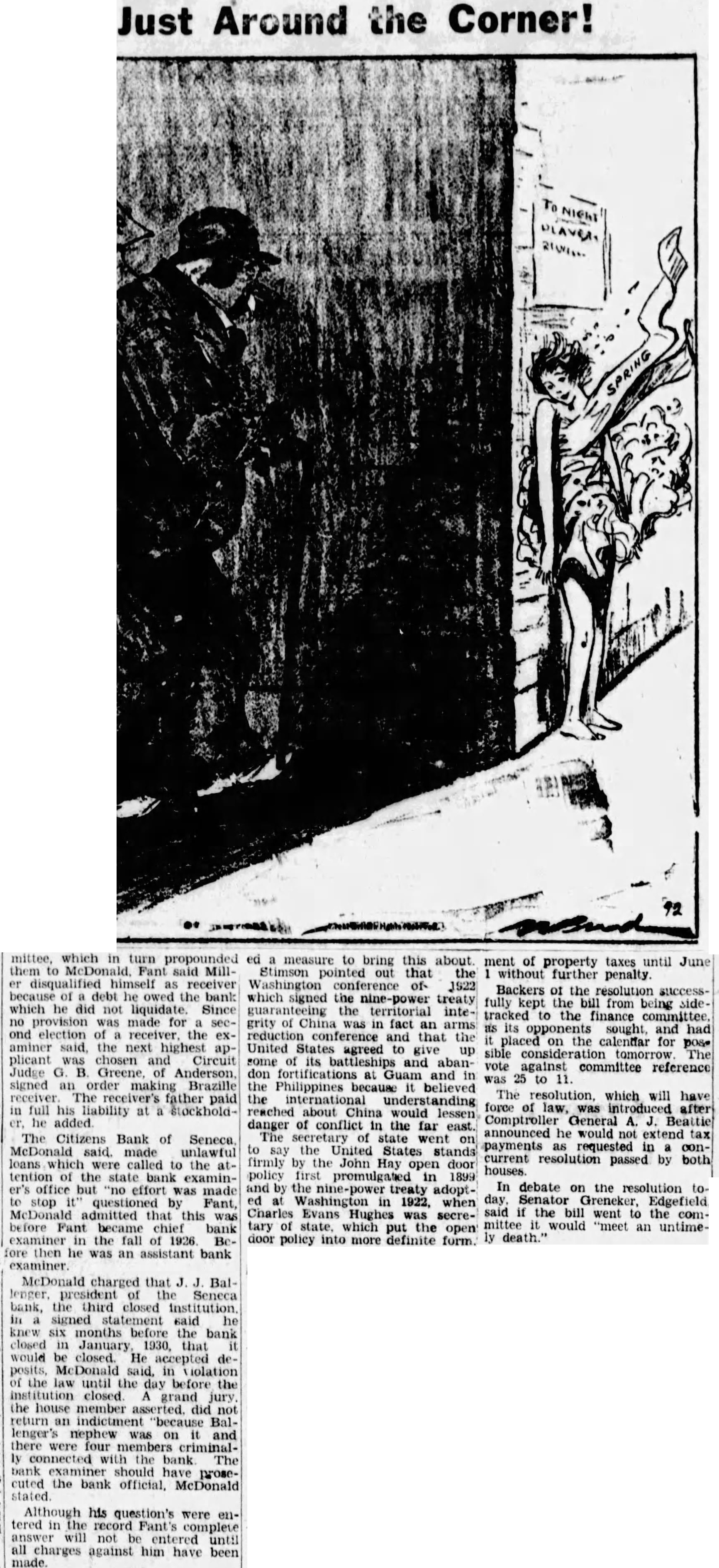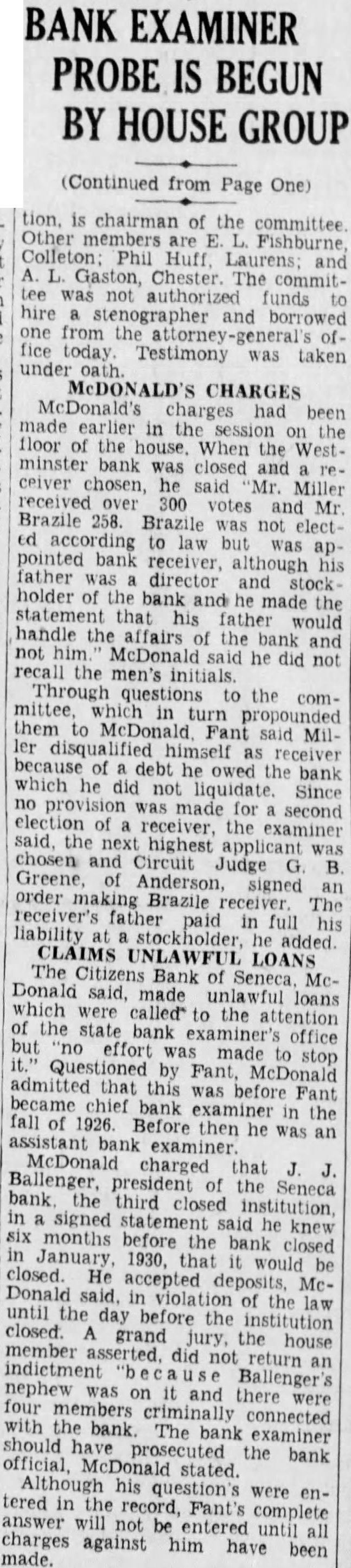 BANK EXAMINER PROBE IS BEGUN BY HOUSE GROUP (Continued from Page One) tion. is chairman of the committee are Phil and Chester was authorized funds stenographer from the Testimony was taken under McDONALD'S CHARGES McDonald's charges the floor the When the West. minster was closed and ceiver chosen, said Mr. Miller Mr Brazile 258. Brazile was not ed according law was appointed bank although father director and stock holder the he made the father would handle the affairs the and not McDonald did not the the comthem to McDonald said Miller receiver because debt he owed the bank which he did not Since no was made for second of receiver the examiner said the highest chosen and Circuit Judge Greene signed order Brazile The receiver's father in full liability CLAIMS UNLAWFUL LOANS The Citizens Bank Seneca, Mc. Donald said, made unlawful loans to the attention state bank but was office stop Questioned Fant, admitted that this was before Fant became bank in the fall 1926 Before then he was an assistant McDonald charged that president Seneca bank third closed institution statement he knew months the bank closed January, closed. He McDonald the closed. until the day before the law grand the house member did not return an indictment nephew was on and four members criminally connected The bank examiner should prosecuted the bank stated. his were entered the Fant's charges answer entered complete against him have been made.