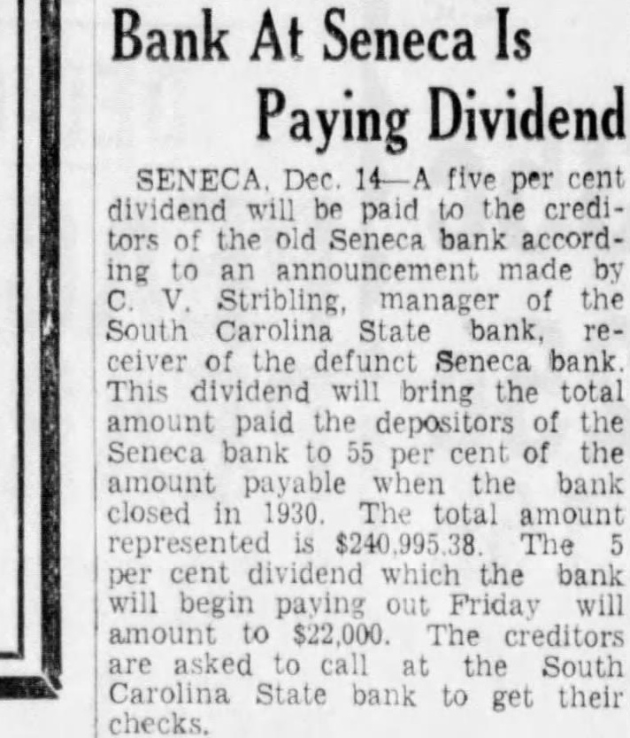 Bank At Seneca Is Paying Dividend SENECA Dec 14-A five per cent dividend will be paid to the creditors of the old Seneca bank according to an announcement made by Stribling manager of the South Carolina State bank, receiver of the defunct Seneca bank This dividend will bring the total amount paid the depositors of the Seneca bank to 55 per cent of the amount payable when the bank closed in 1930 The total amount represented $240,995.38 The 5 per cent dividend which the bank will begin paying out Friday will amount to $22,000 The creditors are asked to call at the South Carolina State bank to get their checks.