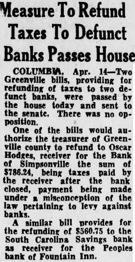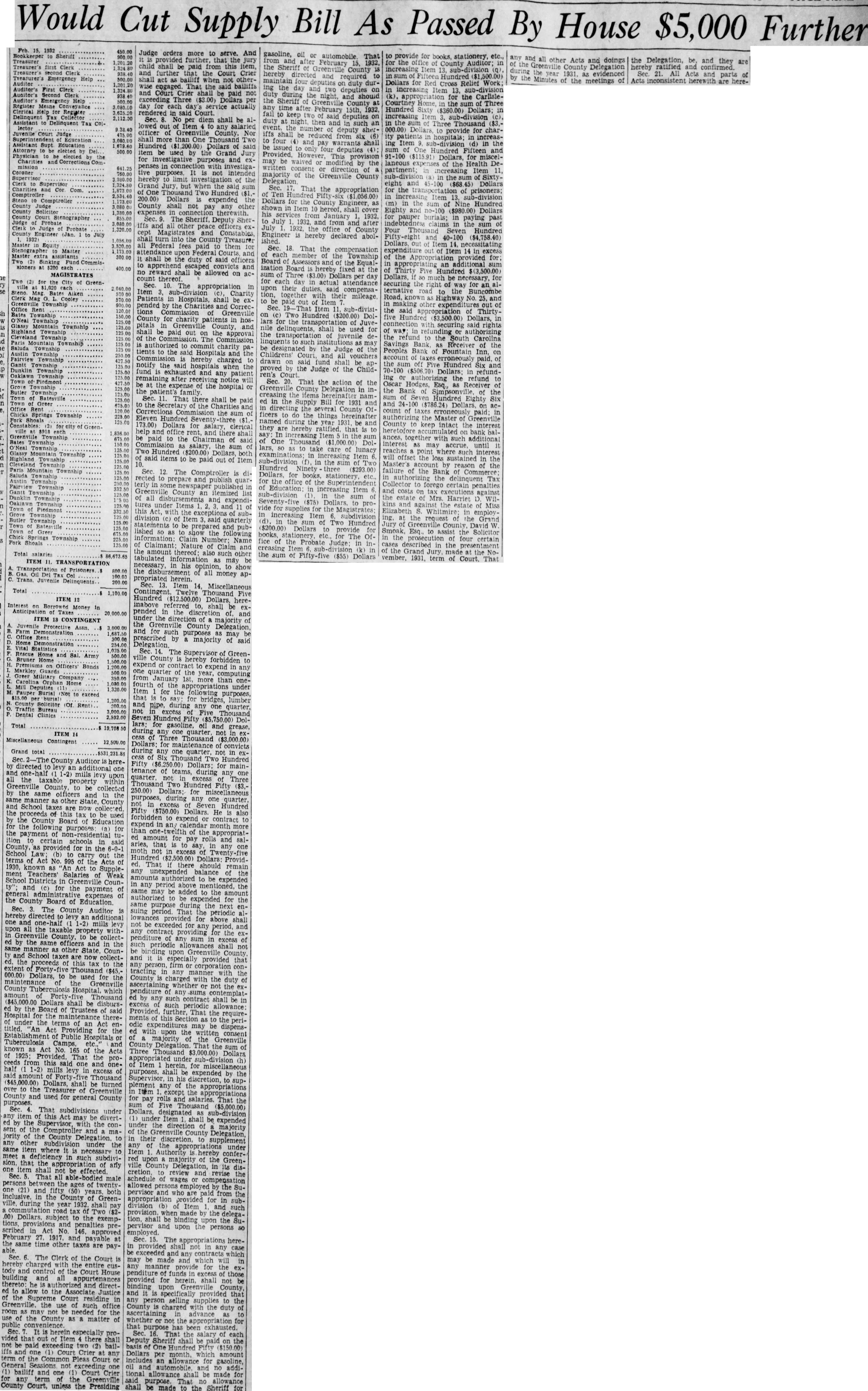 Two (2) for the of Green2,040.00 Steno Mag Mag Bates Clerk Cooley Greenville Township 20.00 Bates Township O'Neal Township Glassy Mountain Township Highland Township Cleveland Mountain Township Saluda Township Austin Township Fairview Township Gantt Township Dunklin Township Oaklawn Township Town Piedmont Township Butler Township Town Batesville Greer Chicks Springs Township Fork Shoals Constables city of Greenville $918 each Greenville Township Bates Township O'Neal Township Glassy Mountain Township Highland Township Cleveland Township Paris Mountain Township Saluda Township Austin Township Fairview Township Gantt Township Dunklin Township Oaklawn Township Town Piedmont Township Butler Township Batesville Greer Chick Springs Township Fork Shoals 125.00 Total salaries 86,673.65 ITEM 11. TRANSPORTATION Prisoners Trans. Juvenile Delinquents. Col 1,100.00 ITEM 12 Interest on Money in Anticipation Taxes 20,000.00 ITEM 13 CONTINGENT Juvenile Protective Assn. Farm Demonstration 1,687.50 Office Rent Home 254.00 Vital Statistics Rescue Bruner Home and Sal. Army Home Premiums Officers' Bonds 1,200.00 Markley 500.00 Greer Military Home Deputies 1,320.00 to exceed 1,200.00 Solicitor (Of. Rent) Traffic Bureau 3,000.00 Dental 2,592.00 Total $ ITEM 14 Miscellaneous Contingent 12,500.00 Grand total Sec County Auditor heredirected to levy an additional one and one-half mills levy the taxable property within Greenville County, be collected by the same officers and in the manner as other State, County and School taxes are now the proceeds of this tax be used the County Board Education for the following purposes for the payment of certain said County, as provided in the School Law; (b) carry out the terms of Act No. 995 of the Acts of 1930. known as Act to Supplement Teachers' Salaries of Weak School Districts Counand (c) for the payment expenses the County Board of Education Sec. The Auditor is directed to levy an one and one-half mills levy upon all the taxable in Greenville County, be collected by the same officers and in the same manner as other State Counand School taxes are now collected. the proceeds tax the extent Forty-five Thousand ($45, 000.00) maintenance Dollars, to be used the of the County which amount Forty Thousand Dollars shall be disbursby the Board of Trustees of said Hospital for of under the Act entitled. Act Providing the Establishment Public Hospitals Tuberculosis Camps, etc. and known as Act of the Acts of Provided the proceeds half from this said one and of 1-2) of excess said amount of Forty Thousand ($45,000.00) Dollars, shall be turned over to the Greenville purposes. County and used for general County Sec That subdivisions under any item of this may be ed by the Supervisor, the consent of the Comptroller and jority of the County Delegation. any other subdivision under the same where it necessary to meet in such subdivision. one that the any item not be effected Sec. That all bodied male persons the ages one (21) and fifty both inclusive. in the County of Greenville. during the year 1932. shall tax Two .00) Dollars. to the exemptions and penalties prescribed in Act No. 146. approved February 27. 1917. and payable at able the same time taxes are pay-