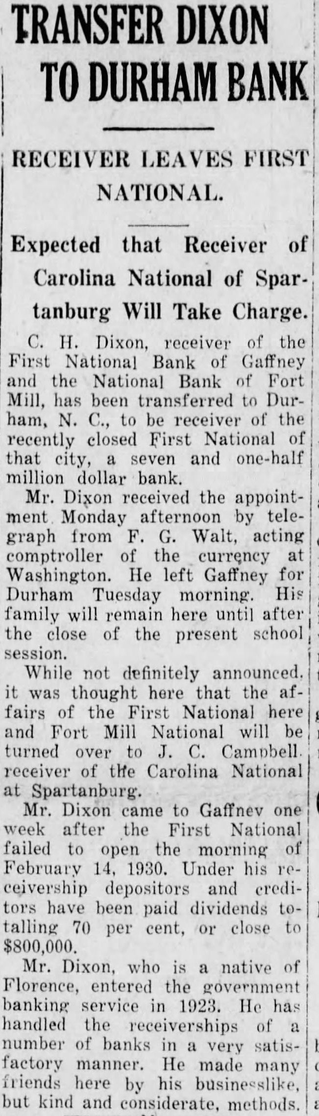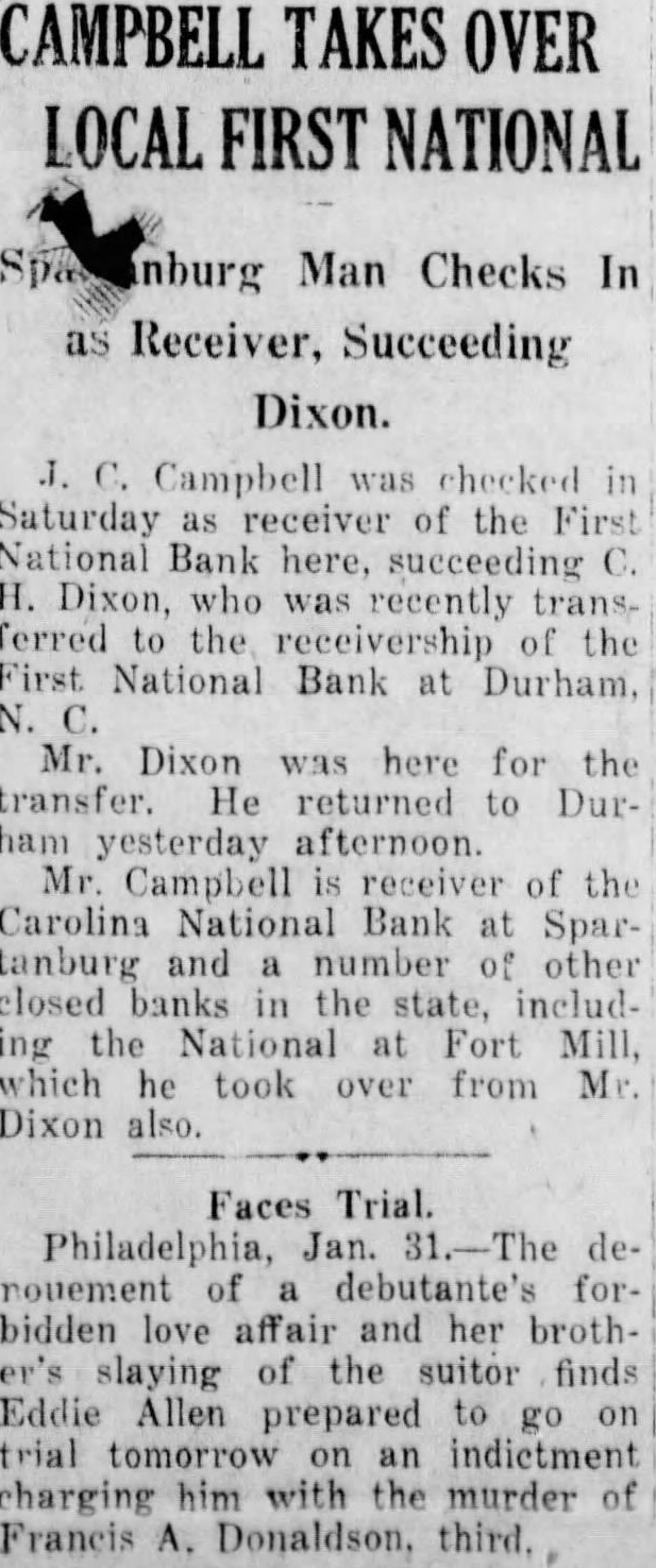 SUES DIRECTORS OF CLOSED BANK Receiver of Spartanburg Bank Seeks Recovery of $183,538 From Defendants. Charlotte Observer Campbell. for the defunct Carolina National bank filed sult in the United States district court of the western district of South Carolina against 15 former directors the institution and the executors of the estates of two deceased members the board for accounting and the recovery of $183,538.33 alleged the ceiver been "negligently and carelessly loaned." The complaint alleges loans were carelessly and negligently made members of the family of Willcashier of the defunct institution, in the amount of to certain employes the bank amounting $35,431 and to the Spartanburg baseball club $24,880 "without adequate security." All of the loan: according to the complaint of the receiver are tal the bank. The Carolina National bank was closed on December 28, 1929 Simultaneously the Dollar Savings bank, state operated in the closed by the or. der of the board of directors