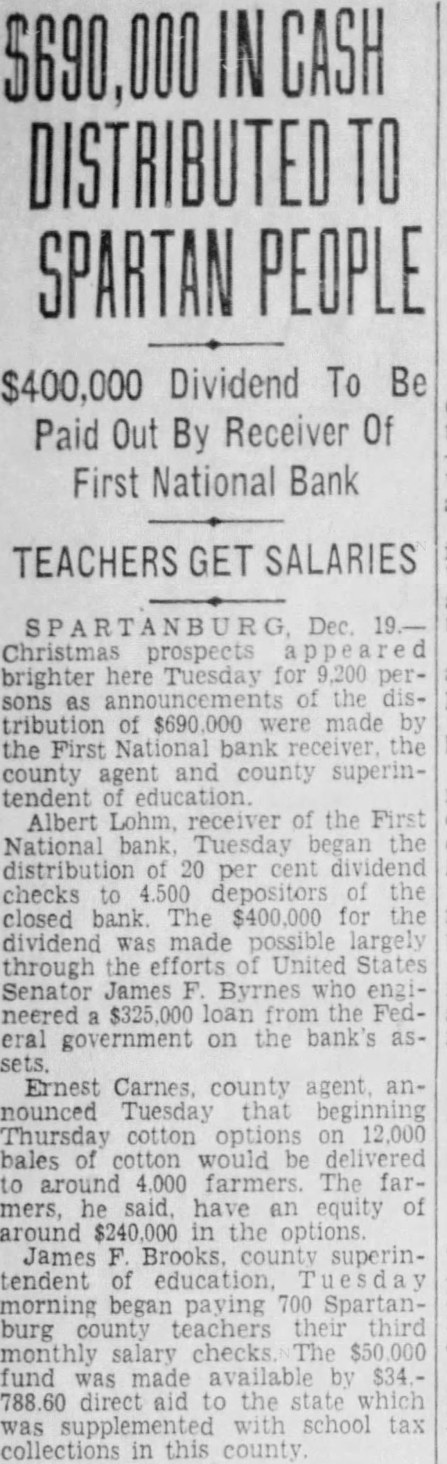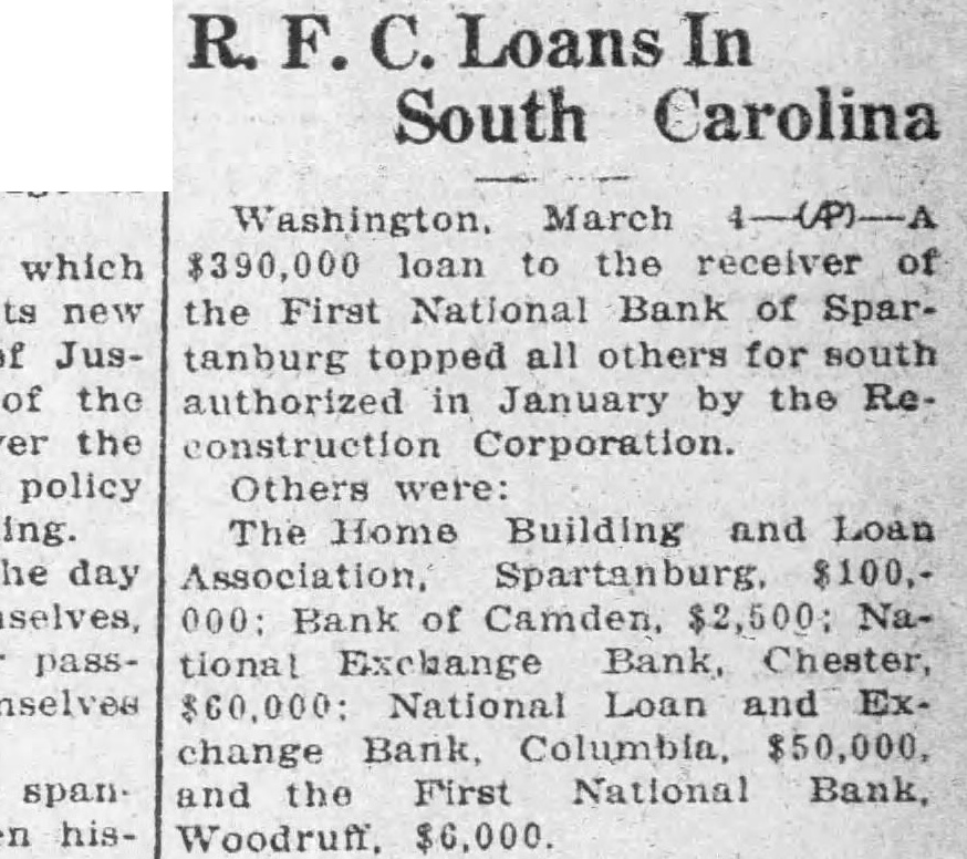 Sue Clevelands For $15,000 In Bank Case SPARTANBURG Oct. Suit against Jesse Cleveland. Mary Patterson Cleveland and Keyland company for $15.000 has been instituted in the United States District Court for the western district of South Carolina by Albert Lohm receiver of the First National Bank of Spartanburg, which closed its doors June 25. The complaint. filed by Nicholls Wyche & Russell alleges that Mr Cleveland caused the Keyland company to be "organized for a fictitious and illegal purpose in fraud of the rights of the plaintiff and as mere of form behind which the defendant Jesse Cleveland. could transact his business" and asks the court "that the defendant. Jesse Cleveland should be adjudged the owner of 300 shares of stock in the First National Bank of Spartanburg. South Carolina and thereupon this plaintiff do have judgment against the defendant. Jesse Cleveland for the sum of $15.000 together with interest thereon from the 12th day of September 1932. at the rate of seven per cent per annum. and for the costs of this action. In his complaint. the bank's receiver alleges that Mr. Cleveland sought to his ownership of 300 shares of First National Bank stock in order "to avoid his responsibility for the stockholders' assessment thereon."