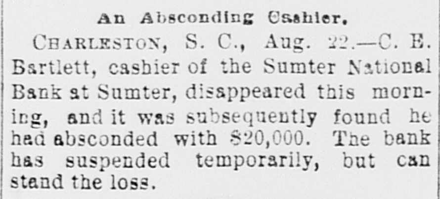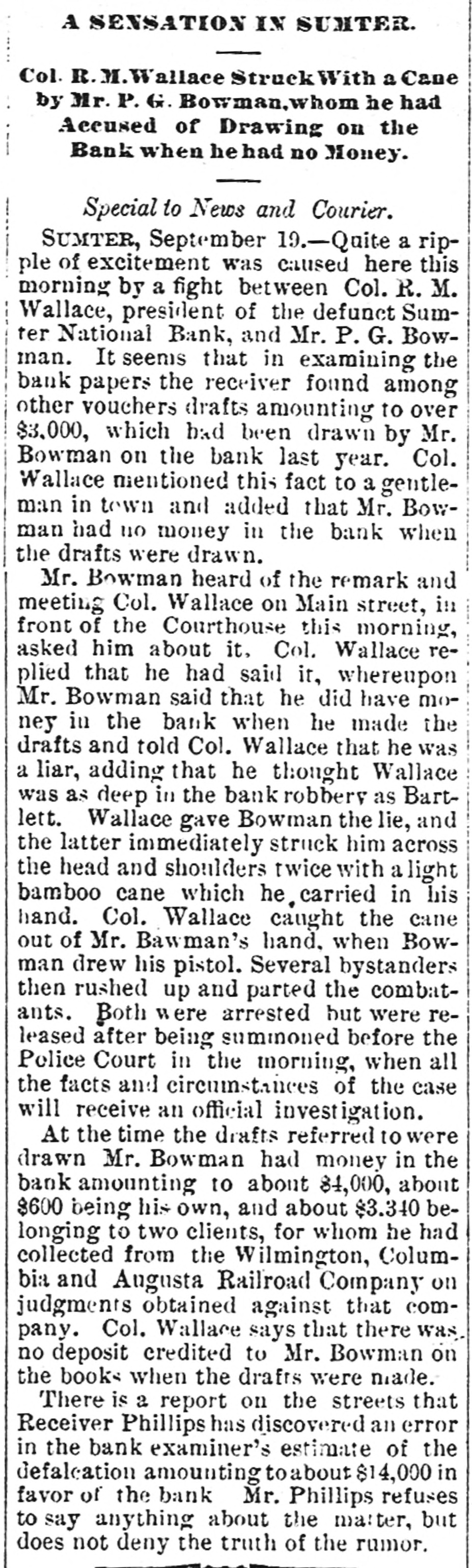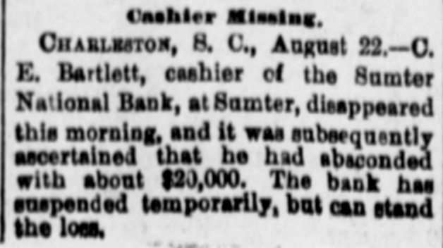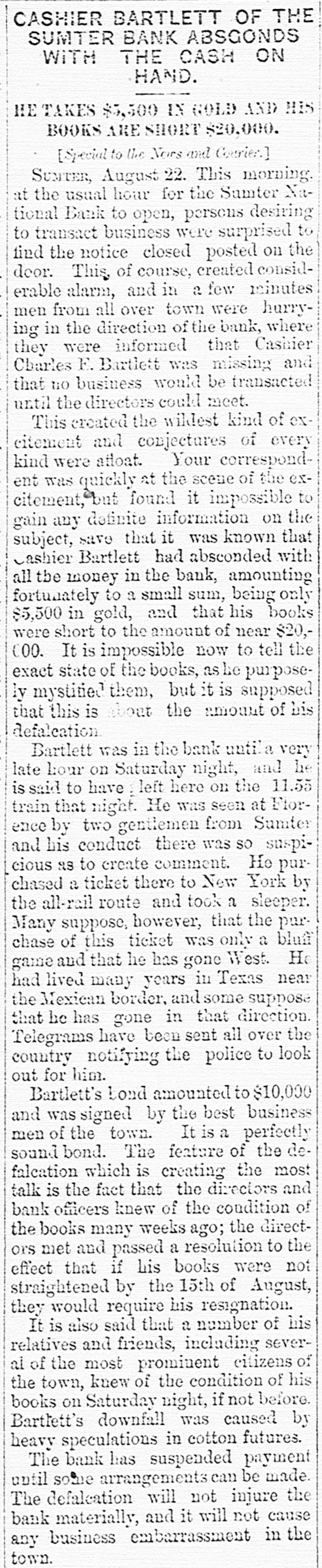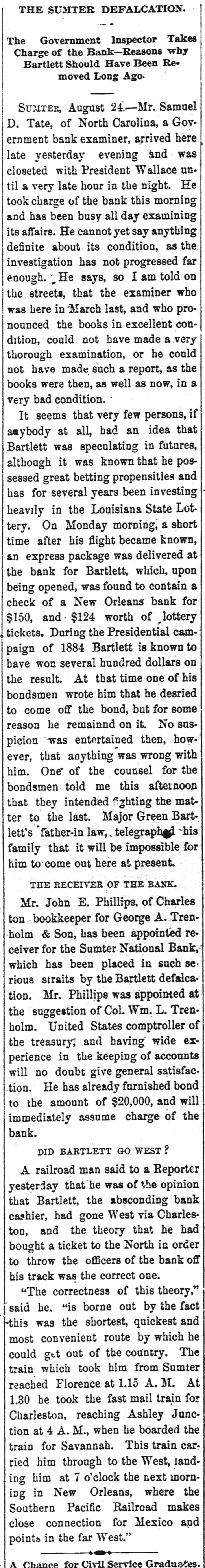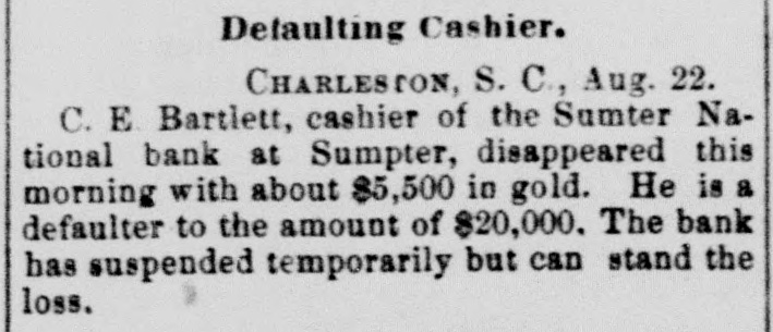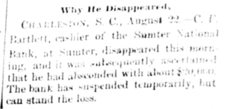 hibits. The inquiries for information about the fair are more numerous than usual, and the indications favor an exceptionally large exhibit of live stock. At Spartanburg, Saturday was appoiuted as the day for the Clifton strikers to show cause before Trial Justice Thackston why they should not be evicted. Mr. Wilson represented the employes and Mr. Simpson the company. The case of Mr. Busby was taken up, and after much evidence and short arguments the Judge decided that the company was entitled to have the writ of ejectment enforced. There are twenty-two other similar cases. C. W. Forster, of Gergetown, expected to make a considerable quantity of scuppernong wine this fall from the vineyard at Friendfield plantation. The vines bore abundantly, and were jealously watched and guarded until a few days ago, when they were left unprotected for a brief interval. When Mr. Forster returned to gather some grapes his vines had been swept clean by the negroes, and not a cluster of the fruit could be found. Richmond Fraser (colored) died after an illness of several weeks. He jumped from a window in the new school building which is being put up in Abbeville for the benefit of the colored people, and hurt ankle. The injury was not thought to be severe at the time, and he continued to work for several days, when he began to suffer. He took his bed, mortification set in, the foot was amputated. and now he is dead. He was study. ing theology with a view to preaching. The fact that SO many deaths have OCcurred among the South Carolina College students, at Camden, caused by fever, is be ing freeiy discussed. The matter ought to be investigated, and, if the cause is in the college buildings or in the water supply of the students, it ought to bespeedily removed or the fact made known that such is not the case, for at present it seems to be believed that the cause of this fever, which has produced death in various parts of the State, lies in the buildings or water supply of the college." The case of W. A. Pollard, ex-postmaster at Greer's Station, near Greenville, for obthe mail and opening letters to pry to secrets, was heard before Commissioner Hawthorn Monday. Pollard was postmaster at Greer's for twelve years before his removal last June on account of complaints of this character. He is charged with breaking open two letters written by Congressman Perry to Dr. League, at Greer's, concerning the management of the office. Pollard was sent up to court, giving bond for $300. The ginning outfit and corn mill of Mr. O. P. Wilson, situated about half a mile from Campbellton, was destroyed by fire Monday. The fire was discovered in the lint room, about 8 o'clock, while the gin was in motion, and the generally accepted theory is that it originated from a match or friction. The loss, including nine bales of cotton, a quantity of cotton seed, damage to engine, etc., will probably amount to $2,000 he property was insured in the Home, of New York, for $1,000, two-thirds of which amount is collectible. Jesse Blaine, a colored man living on Waccamaw, was shot and killed at Clifton plantation on Monday night by Titus Small (colored). The shooting was done with a shotgun, and death ensued almost immediately. The tragedy is said to have been caused by Blaine's intimacy with Small's wife. It is said that Blaine sent the woman over to Georgetown Monday night, and had made arrangements to meet her the next morning, when they were to go to Charleston together. The murderer fled, and has not yet been arrested. Mr. A. K. Mann, while working at Cruise's mill, in Anderson county, last week, was bitten twice on the right forearm by a spider, and the result was a highly inflamed wound and a great deal of physical suffering. Before going to work Mr. Mann donned an old woolen shirt, expecting to get wet while working about the wheel, and did not notice until after he felt the sting of a bite the second time that a large spider had made a nest in the sleeve of the shirt. When he felt the first sting he rubbed the place slightly, thinking it was a splinter, and at the second sting he rubbed more vigorously, but still kept at work. In about an hour the pain increased a great deal and the wrist began to swell, when an examination showed the remains of a large spider and a nest of eggs mashed over the arm. Theskin came off all over the surface touched by the mashed substance, showing the intensely poisonous nature of the insect. E. W Moise, Jr., a son of Charles H, Moise, of Sumter, has written home that he saw Charles E. Bartlett. the defaulting bank cashier, in San Antonio, Texas, a few days ago. Mr. Moise has been a resident of San Antonio for a number of years, and knew Bartlett both out there and at home. This verifies the belief that many persons have that Bartlett went to Mexico, although it is somewhat a mystery how he could have also been seen in Washington and New York, as has been reported on reliable authority. There is also a belief among a large number of people that he has gone to South America. When he took the North-eastern train for Charleston, on the night of his flight, he could have continued to Tampa, Fla., and reached that city the same day that a vessel was advertised to sail for South America. There is nothing new relative to the bank failure. Receiver Phillips isquietly working away winding up the business, although it is hard to tell when he will finish. Bartlett's bondsmen hold occasional meetings, but nothing can be gotten out of them concerning their proposed course. Some of them intend to fight to the lastagainst being held liable, while a number of them express themselves as willing to pay up their quota of the bond and have no further trouble about it. It is not yet known whether or not the matter will be tried at the October court. SUMTER, Sept. 19.-Special -Q a ripple of excitement was caused at Sumter Monday morning by a fight between Col. R. M. Wallace, President of the defunct Sumter National Bank, and
