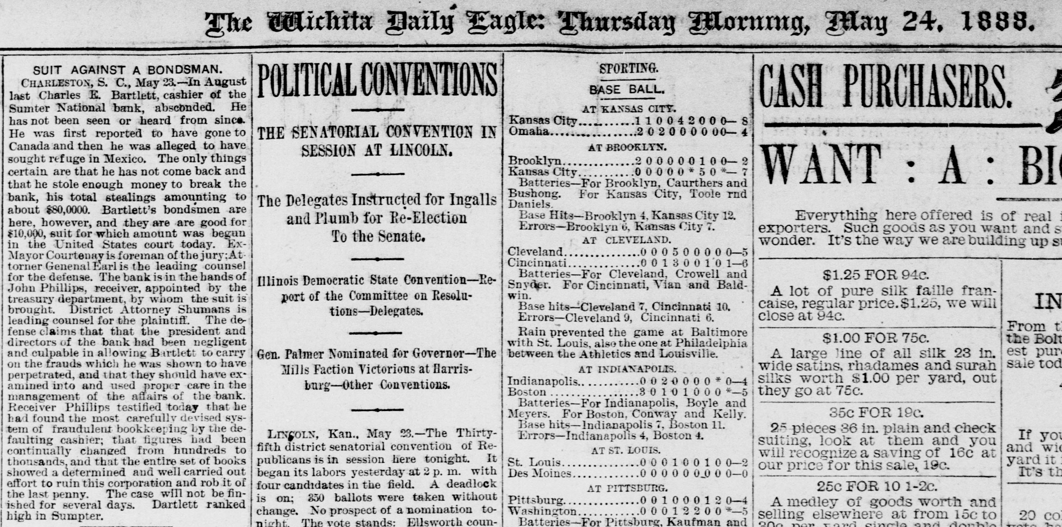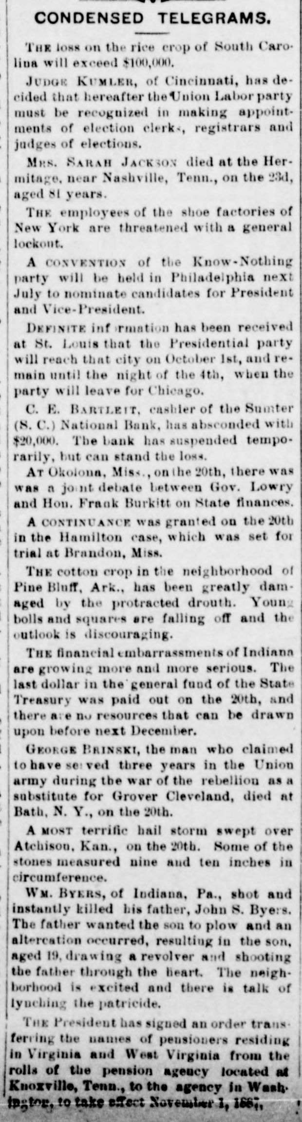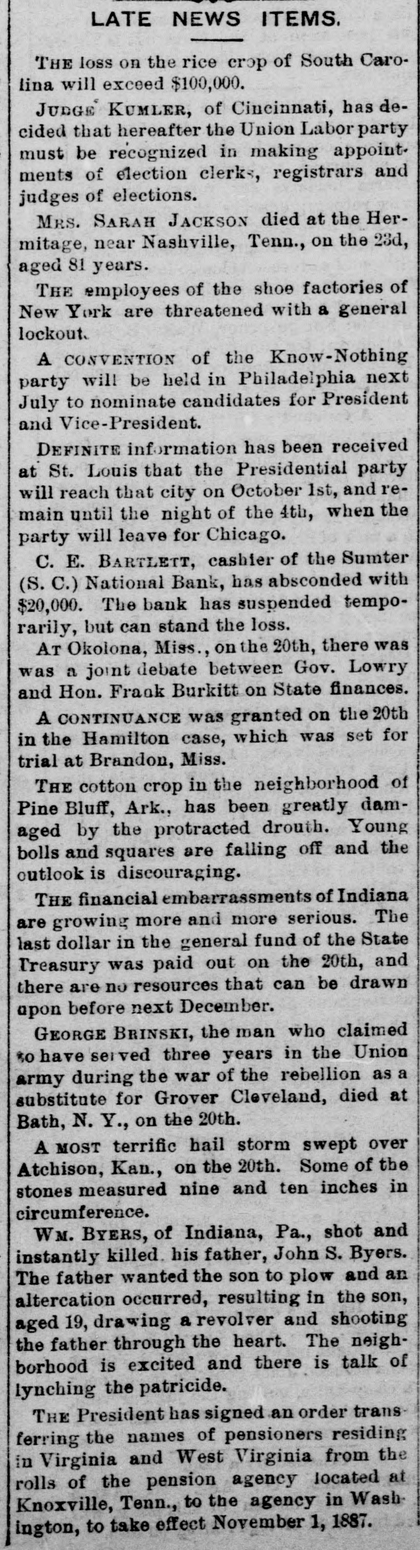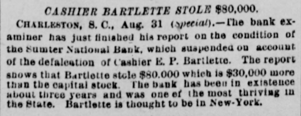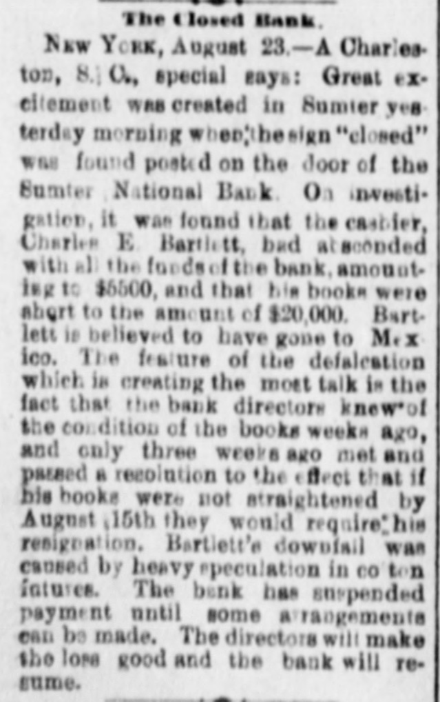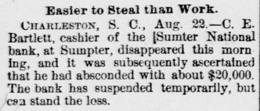 hibits. The inquiries for information about the fair are more numerous than usual, and the indications favor an exceptionally large exhibit of live stock. At Spartanburg, Saturday was appoiuted as the day for the Clifton strikers to show cause before Trial Justice Thackston why they should not be evicted. Mr. Wilson represented the employes and Mr. Simpson the company. The case of Mr. Busby was taken up, and after much evidence and short arguments the Judge decided that the company was entitled to have the writ of ejectment enforced. There are twenty-two other similar cases. C. W. Forster, of Gergetown, expected to make a considerable quantity of scuppernong wine this fall from the vineyard at Friendfield plantation. The vines bore abundantly, and were jealously watched and guarded until a few days ago, when they were left unprotected for a brief interval. When Mr. Forster returned to gather some grapes his vines had been swept clean by the negroes, and not a cluster of the fruit could be found. Richmond Fraser (colored) died after an illness of several weeks. He jumped from a window in the new school building which is being put up in Abbeville for the benefit of the colored people, and hurt ankle. The injury was not thought to be severe at the time, and he continued to work for several days, when he began to suffer. He took his bed, mortification set in, the foot was amputated. and now he is dead. He was study. ing theology with a view to preaching. The fact that SO many deaths have OCcurred among the South Carolina College students, at Camden, caused by fever, is be ing freeiy discussed. The matter ought to be investigated, and, if the cause is in the college buildings or in the water supply of the students, it ought to bespeedily removed or the fact made known that such is not the case, for at present it seems to be believed that the cause of this fever, which has produced death in various parts of the State, lies in the buildings or water supply of the college." The case of W. A. Pollard, ex-postmaster at Greer's Station, near Greenville, for obthe mail and opening letters to pry to secrets, was heard before Commissioner Hawthorn Monday. Pollard was postmaster at Greer's for twelve years before his removal last June on account of complaints of this character. He is charged with breaking open two letters written by Congressman Perry to Dr. League, at Greer's, concerning the management of the office. Pollard was sent up to court, giving bond for $300. The ginning outfit and corn mill of Mr. O. P. Wilson, situated about half a mile from Campbellton, was destroyed by fire Monday. The fire was discovered in the lint room, about 8 o'clock, while the gin was in motion, and the generally accepted theory is that it originated from a match or friction. The loss, including nine bales of cotton, a quantity of cotton seed, damage to engine, etc., will probably amount to $2,000 he property was insured in the Home, of New York, for $1,000, two-thirds of which amount is collectible. Jesse Blaine, a colored man living on Waccamaw, was shot and killed at Clifton plantation on Monday night by Titus Small (colored). The shooting was done with a shotgun, and death ensued almost immediately. The tragedy is said to have been caused by Blaine's intimacy with Small's wife. It is said that Blaine sent the woman over to Georgetown Monday night, and had made arrangements to meet her the next morning, when they were to go to Charleston together. The murderer fled, and has not yet been arrested. Mr. A. K. Mann, while working at Cruise's mill, in Anderson county, last week, was bitten twice on the right forearm by a spider, and the result was a highly inflamed wound and a great deal of physical suffering. Before going to work Mr. Mann donned an old woolen shirt, expecting to get wet while working about the wheel, and did not notice until after he felt the sting of a bite the second time that a large spider had made a nest in the sleeve of the shirt. When he felt the first sting he rubbed the place slightly, thinking it was a splinter, and at the second sting he rubbed more vigorously, but still kept at work. In about an hour the pain increased a great deal and the wrist began to swell, when an examination showed the remains of a large spider and a nest of eggs mashed over the arm. Theskin came off all over the surface touched by the mashed substance, showing the intensely poisonous nature of the insect. E. W Moise, Jr., a son of Charles H, Moise, of Sumter, has written home that he saw Charles E. Bartlett. the defaulting bank cashier, in San Antonio, Texas, a few days ago. Mr. Moise has been a resident of San Antonio for a number of years, and knew Bartlett both out there and at home. This verifies the belief that many persons have that Bartlett went to Mexico, although it is somewhat a mystery how he could have also been seen in Washington and New York, as has been reported on reliable authority. There is also a belief among a large number of people that he has gone to South America. When he took the North-eastern train for Charleston, on the night of his flight, he could have continued to Tampa, Fla., and reached that city the same day that a vessel was advertised to sail for South America. There is nothing new relative to the bank failure. Receiver Phillips isquietly working away winding up the business, although it is hard to tell when he will finish. Bartlett's bondsmen hold occasional meetings, but nothing can be gotten out of them concerning their proposed course. Some of them intend to fight to the lastagainst being held liable, while a number of them express themselves as willing to pay up their quota of the bond and have no further trouble about it. It is not yet known whether or not the matter will be tried at the October court. SUMTER, Sept. 19.-Special -Q a ripple of excitement was caused at Sumter Monday morning by a fight between Col. R. M. Wallace, President of the defunct Sumter National Bank, and