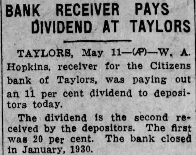 PAID FOR COUNTY PROPERTY J. G. Mullinax Buys Taylors Realty From Bank Receiver For $1,725 Deeds recording four transfers of Greenville county property with total valuation $8,140.20 were recorded yesterday by Ira A. Gresham, register of mesne conveyance. Three of the deeas follow: Hopkins, as receiver of the Citizens Bank Taylors, Mullinax, for $1,725, property in Taylors The First Carolinas Joint Stock Land Bank of Columbia to E. Burns, for $1,969.20, tract of acres in the Gantt township. Patterson, as trustee, Mrs. Thelma Cothran Baldwin. for $445, property in Marshall Forest.