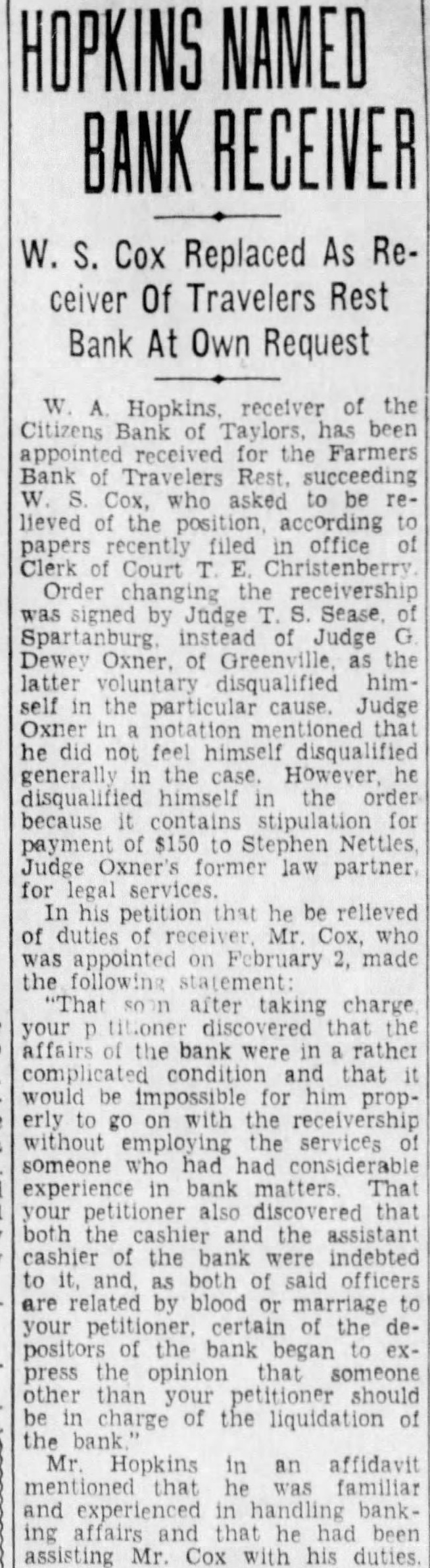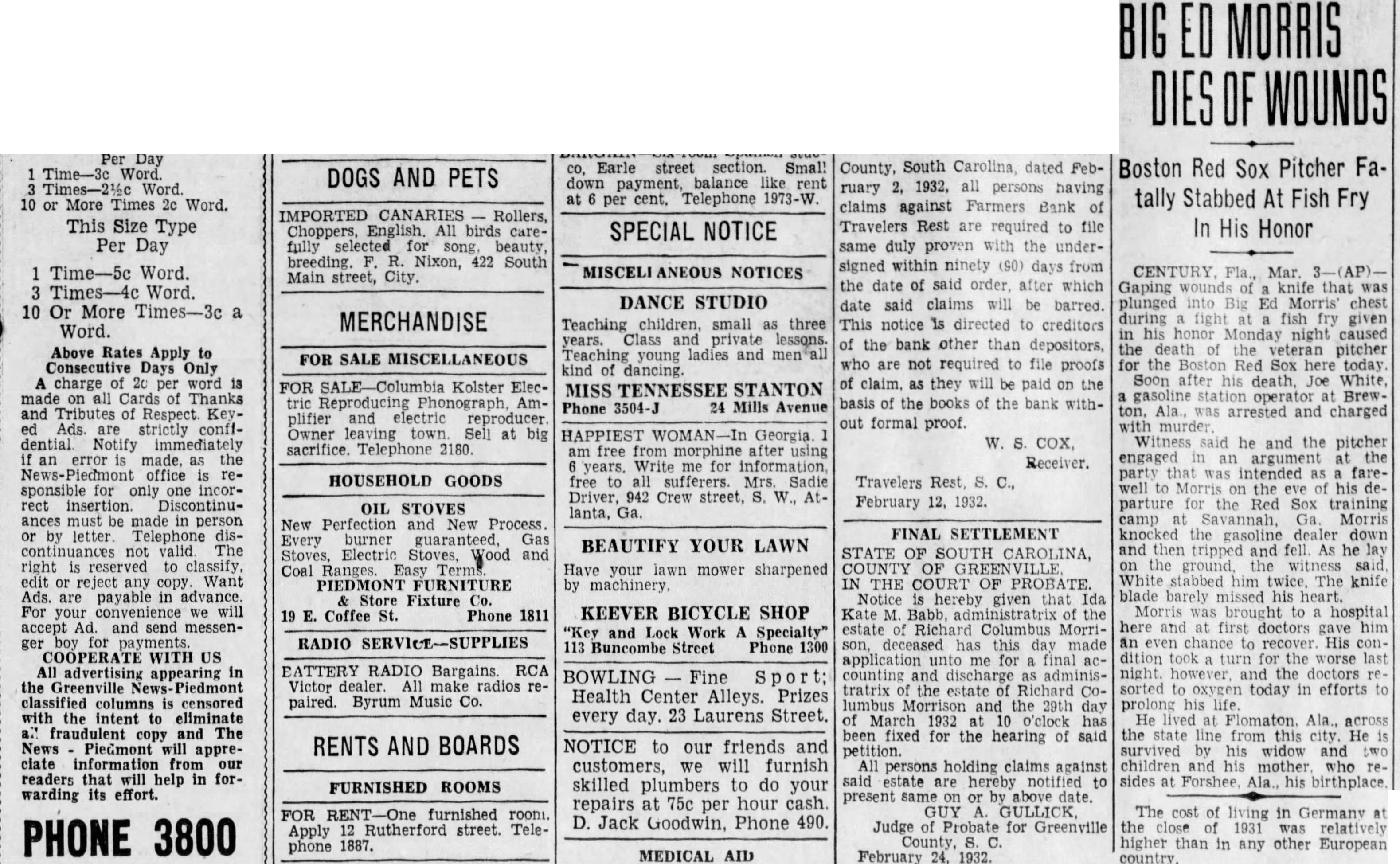 ED MORRIS CO, Earle street section. Small County, South Carolina, dated Feb- Boston Red Sox Pitcher FaTime-3c Word. DOGS AND PETS down payment, balance like ruary 2, 1932, all persons having at per cent. Telephone 1973-W. tally Stabbed At Fish Fry or More Times 2c Word. claims against Farmers Bank of IMPORTED CANARIES Rollers, This Size Type Travelers Rest are required to file In His Honor Choppers, English. All care- SPECIAL NOTICE signed within ninety ($0) days from Time-5c Word. MISCELI NOTICES CENTURY, Fla., Mar. Main street, City. the date of said order, after which Gaping wounds knife that was 3 Word. DANCE STUDIO date said claims will be barred. plunged into Big Ed Morris' chest 10 Or More Times-3c MERCHANDISE during fight at fish fry given Teaching children, small as three This notice is directed to creditors Word. his honor Monday night caused years. Class and private lessons. of the bank other than depositors, Above Rates Apply the death the pitcher Teaching young ladies and FOR SALE MISCELLANEOUS who are not required to file proofs for the Red Sox here today Consecutive Days Only kind of dancing. charge per word is of claim, as they will be paid on the Soon after his death, Joe White FOR Kolster Elec- MISS TENNESSEE STANTON Thanks gasoline Brewtric Reproducing Phonograph, basis of the books of the bank withPhone 3504-J Mills Avenue and Tributes of Respect. Key- ton, Ala. was arrested and charged plifier and reproducer out formal proof. confi- murder are strictly Owner at big HAPPIEST WOMAN-In Georgia. dential Notify immediately COX, Witness said he and the pitcher sacrifice. Telephone 2180. am free from morphine after using an error made, the engaged an argument the Receiver. years. Write me for office party that was intended as fareHOUSEHOLD GOODS free all Mrs. Travelers Rest, S. C., sponsible only one incor- well Morris on the of his deDriver, 942 Crew street, S. W., Atinsertion. Discontinu- February 12, 1932. parture for the Red Sox training OIL STOVES lanta, Ga. ances must be made in person camp Ga. Morris New Perfection New Process letter. Telephone dis- FINAL SETTLEMENT knocked the gasoline down Every burner guaranteed, BEAUTIFY YOUR LAWN STATE OF CAROLINA, and then tripped and As Stoves, Electric Stoves, to classify, OF ground, the witness said Coal Easy Have your lawn mower sharpened reject Want White stabbed him twice. The knife PIEDMONT by THE COURT OF PROBATE. Ads. are payable in advance. blade barely missed his Store Fixture Notice hereby given that Ida For your convenience we Coffee 1811 KEEVER BICYCLE SHOP Kate Babb, of the Morris was brought to hospital St. Phone accept Ad. and send messen- estate Richard Columbus Morri- here and first doctors gave him and Lock Work Specialty" ger boy for RADIO an even chance to recover con113 Buncombe Street Phone 1300 son, deceased has this day made COOPERATE WITH US dition took turn for the worse last application me final All advertising appearing in EATTERY RADIO Bargains. RCA night. however, and the doctors BOWLING Fine counting and discharge administhe Greenville Piedmont Victor radios re- sorted oxygen today in efforts tratrix estate Richard CoHealth Center Alleys. Prizes columns censored paired. Byrum Music Co. prolong his Morrison and the 29th day with the intent eliminate every day. 23 Laurens Street. March 1932 o'clock Flomaton. Ala., across fraudulent copy and The fixed for the hearing of said the line from this city. He RENTS AND BOARDS NOTICE to our friends and News Piedmont will appre- petition. survived by his widow and two clate information from customers, we will furnish persons holding claims against children and his mother. who readers that will help in forsaid estate are hereby notified to sides Forshee, Ala., his birthplace. FURNISHED ROOMS skilled plumbers to do your repairs at 75c per hour cash. FOR furnished room. The cost of living in Germany D. Jack Goodwin, Phone 490. Judge of Probate for Greenville the close 1931 was relatively Apply Rutherford street. TelePHONE 3800 1887. County, higher than in any other European phone MEDICAL AID February 24, 1932. country.