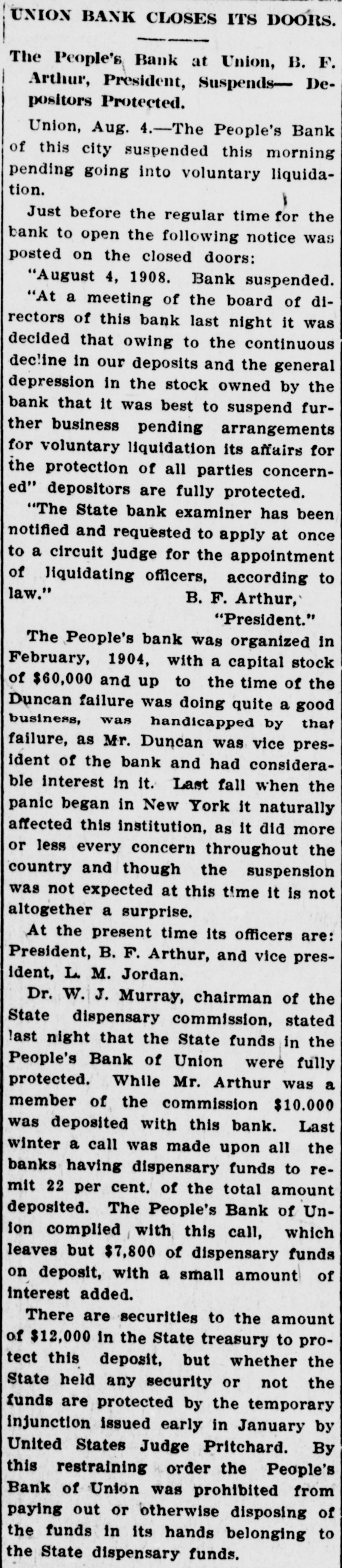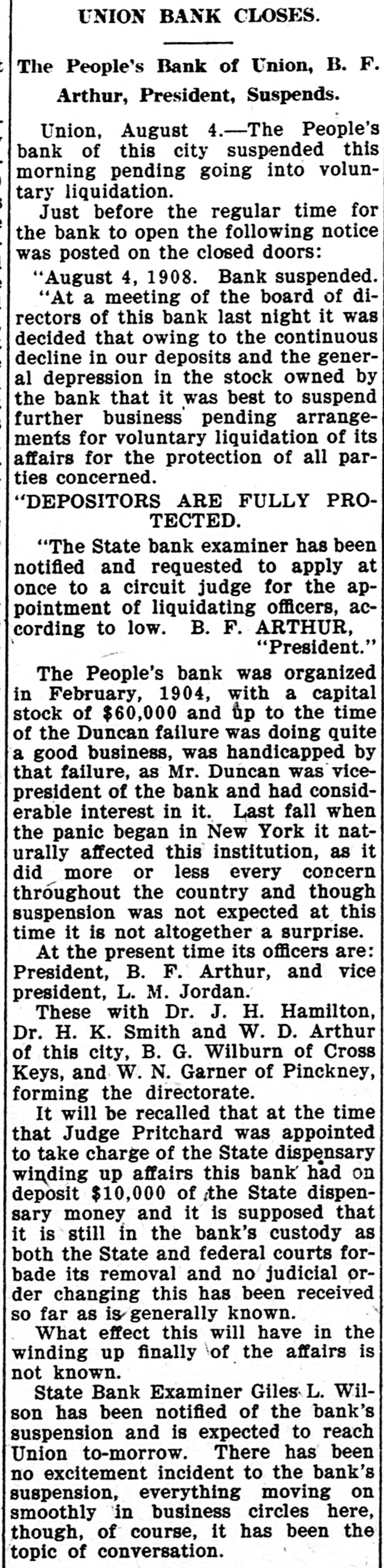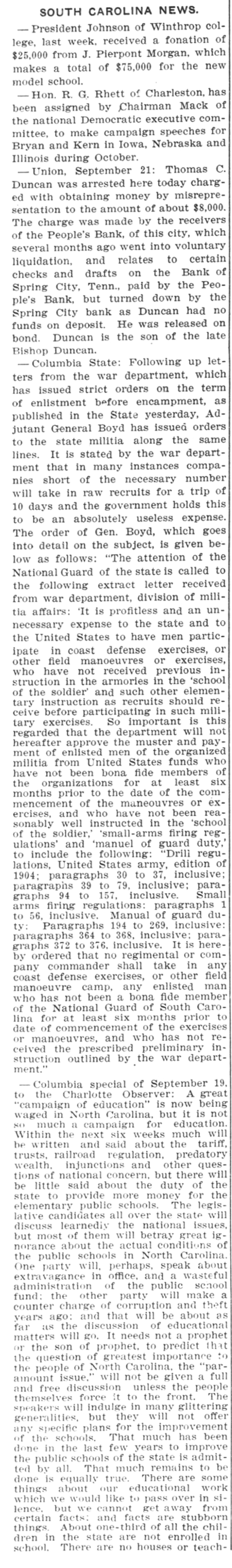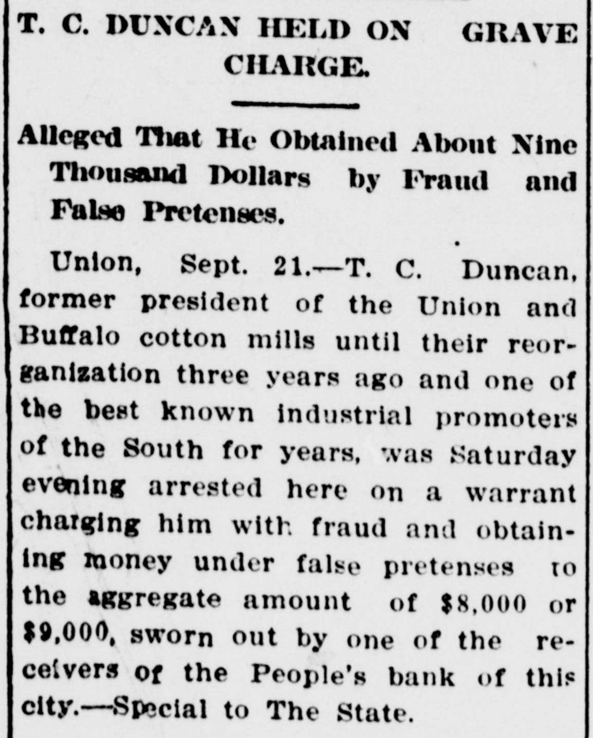 Union, June 30: T. C. Duncan, former president of the Union-Buffalo Mills and other allied enterprises of this city, and late head of the American Lime Company, bankrupt, of Spring City, Tenn., must answer to the charge of fraud before a higher court in this county. This was the outcome of the preliminary hearing before Magistrate J. Frost Walker, Jr., held here yesterday in the criminal proceedings brought by John H. Morris, who charges T. C. Duncan with fraud on account of a check issued December, 1906, when it is alleged there were no funds in the bank of Spring City, Tenn., to meet it, the first step of which was the arrest of Mr. Duncan several weeks ago and his immediate release on bail in the sum of $1,500. Yesterday's preliminary was held in Magistrate Walker's office and about 25 persons were present, Duncan was represented by J. P. K. Bryan of Charleston, James Munro and Ben F. Townsend of this city. John H. Morris, who instituted the proceedings and swore out the warrants, had no counsel. Four witnesses were sworn. B. F. Arthur, former president of the People's bank, H. B. O'Shields, former assistant cashier of the same institution, W. H. Gist, president of the Bank of Carlisle, the three foregoing being receivers of this bank. The testimony of these witnesses was such that after all the evidence had been given in and various letters and telegrams admitted in evidence Magistrate Walker ruled that the case should go to a higher court. Following the preliminary hearing Magistrate Walker allowed the same bond to remain in force.