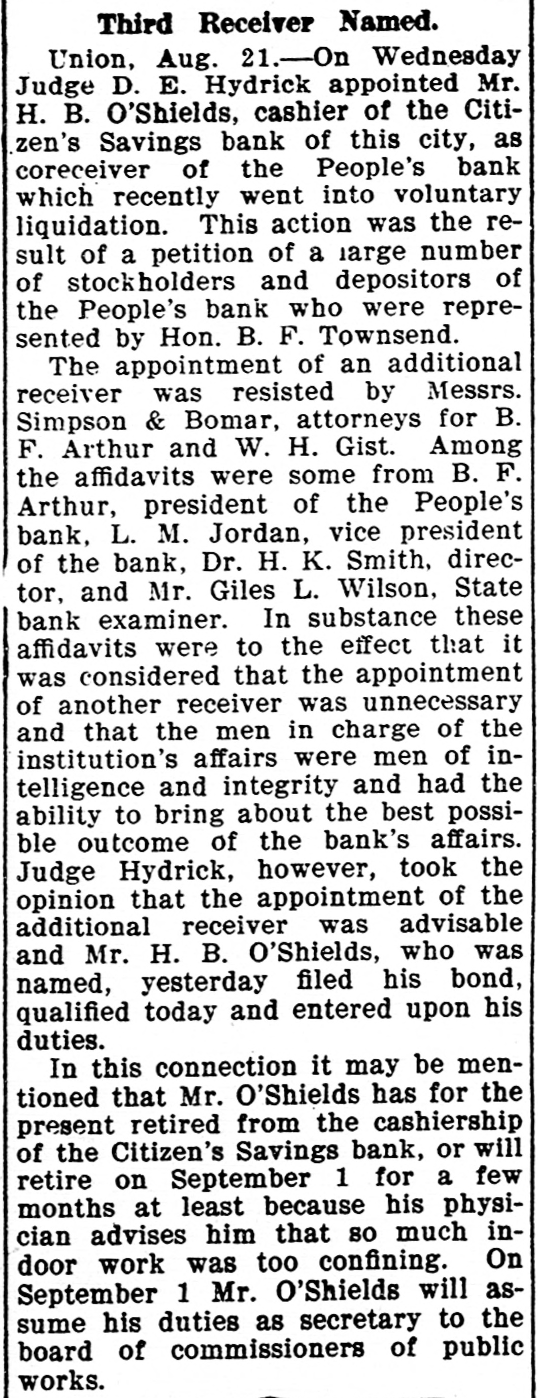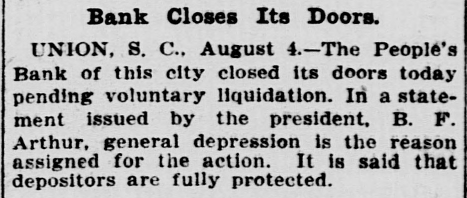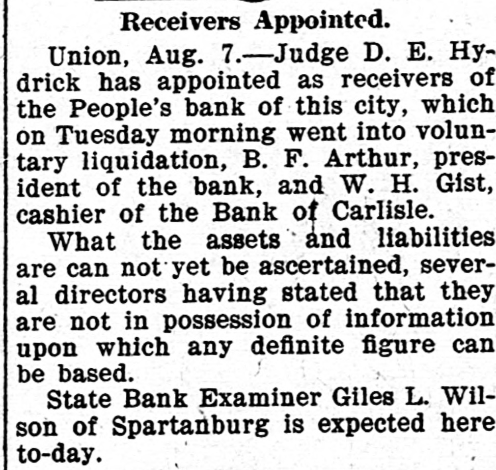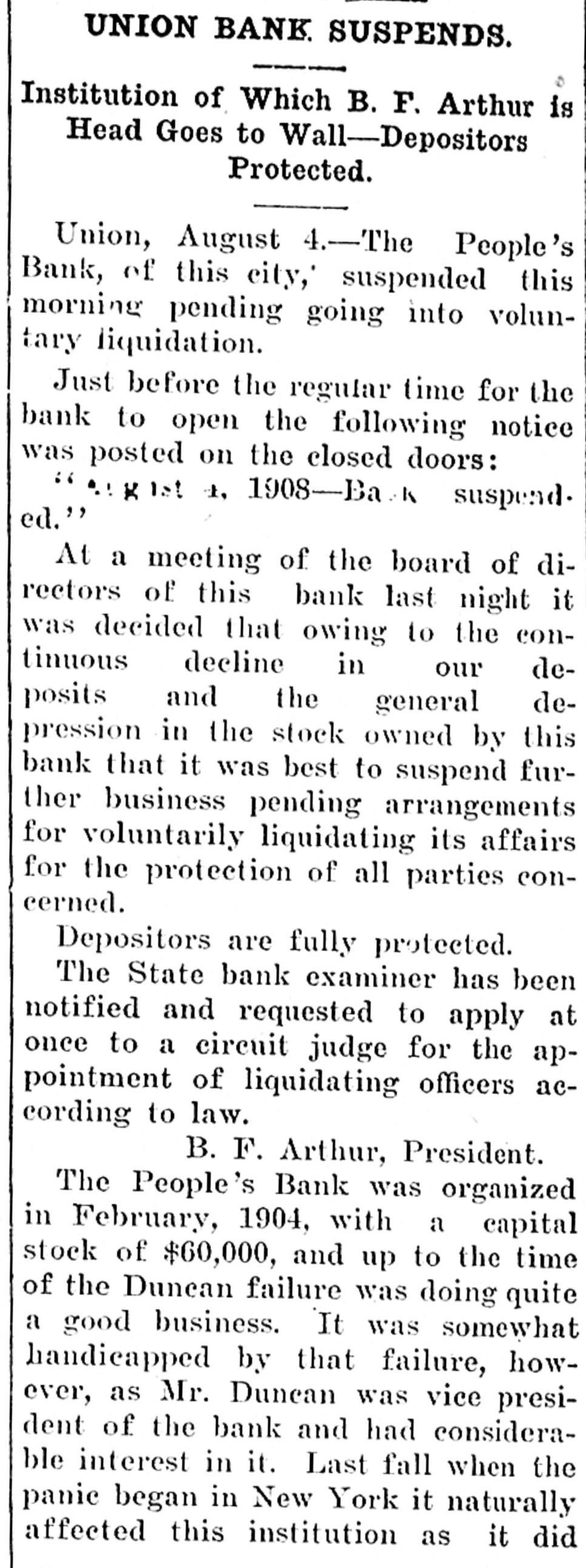 Union, June 30: T. C. Duncan, former president of the Union-Buffalo Mills and other allied enterprises of this city, and late head of the American Lime Company, bankrupt, of Spring City, Tenn., must answer to the charge of fraud before a higher court in this county. This was the outcome of the preliminary hearing before Magistrate J. Frost Walker, Jr., held here yesterday in the criminal proceedings brought by John H. Morris, who charges T. C. Duncan with fraud on account of a check issued December, 1906, when it is alleged there were no funds in the bank of Spring City, Tenn., to meet it, the first step of which was the arrest of Mr. Duncan several weeks ago and his immediate release on bail in the sum of $1,500. Yesterday's preliminary was held in Magistrate Walker's office and about 25 persons were present, Duncan was represented by J. P. K. Bryan of Charleston, James Munro and Ben F. Townsend of this city. John H. Morris, who instituted the proceedings and swore out the warrants, had no counsel. Four witnesses were sworn. B. F. Arthur, former president of the People's bank, H. B. O'Shields, former assistant cashier of the same institution, W. H. Gist, president of the Bank of Carlisle, the three foregoing being receivers of this bank. The testimony of these witnesses was such that after all the evidence had been given in and various letters and telegrams admitted in evidence Magistrate Walker ruled that the case should go to a higher court. Following the preliminary hearing Magistrate Walker allowed the same bond to remain in force.
