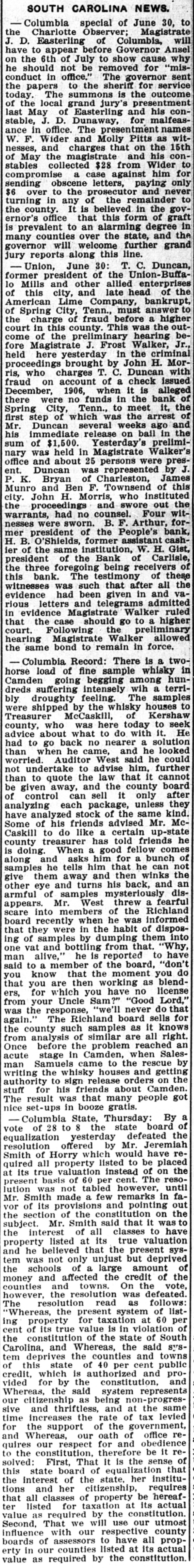 Columbia special of June 30, to the Charlotte Observer; Magistrate J. D. Easterling of Columbia, will have to appear before Governor Ansel on the 6th of July to show cause why he should not be removed for "misconduct in office." The governor sent the papers to the sheriff for service today. The summons is the outcome of the local grand jury's presentment last May of Easterling and his constable, J. D. Dunaway, for malfeasance in office. The presentment names W. F. Wider and Molly Pitts as witnesses, and charges that on the 15th of May the magistrate and his constables collected $28 from Wider to compromise a case against him for sending obscene letters, paying only $6 over to the prosecutor and never turning in any of the remainder to the county. It is believed in the governor's office that this form of graft is prevalent to an alarming degree in many counties over the state, and the governor will welcome further grand jury reports along this line.