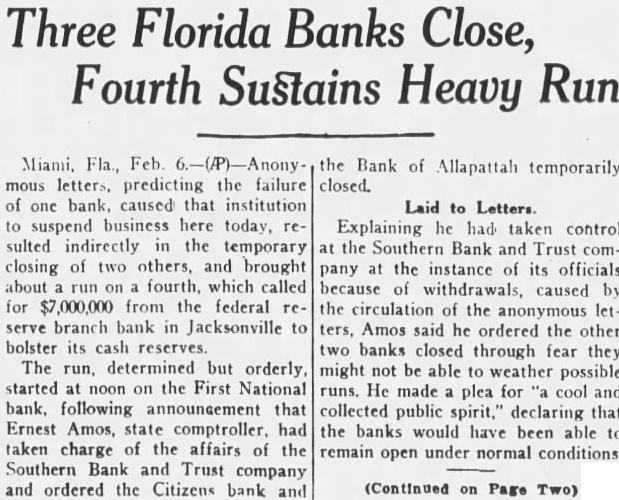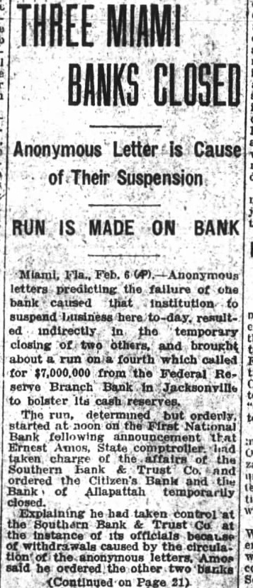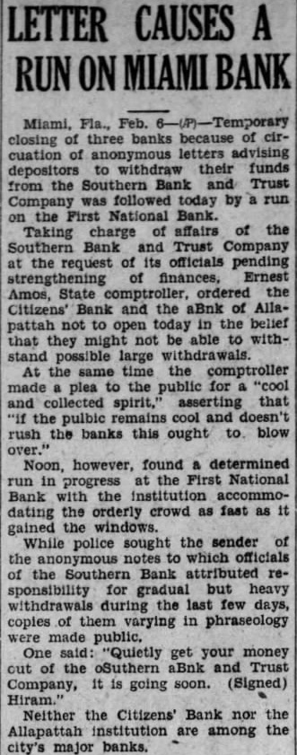 J. E. Lummus, President of the Southern Bank & Trust Company. said circulation of anonymous letters attacking his bank had caused an unexpected run on the institution which resulted in its failure to open. Ernest Amos, State Comptroller, took charge of the Southern Bank & Trust Company. Amos claimed its failure to open had caused runs on the Citizens Bank of Allapattah. which they were not able to withstand.