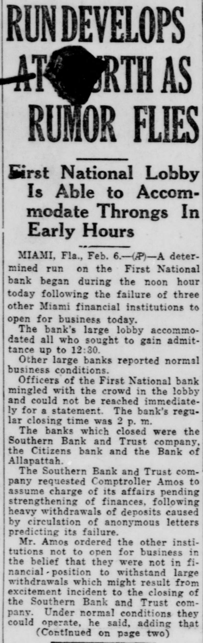 RUNDEVELOPS AT RTH AS RUMOR FLIES First National Lobby Is Able to Accommodate Throngs In Early Hours MIAMI, Fla., Feb. 6.-(AP)-A determined run on the First National bank began during the noon hour today following the failure of three other Miami financial institutions to open for business today. The bank's large lobby accommodated all who sought to gain admittance up to 12:30. Other large banks reported normal business conditions. Officers of the First National bank mingled with the crowd in the lobby and could not be reached immediately for a statement. The bank's regular closing time was 2 p. m. The banks which closed were the Southern Bank and Trust company, the Citizens bank and the Bank of Allapattah. The Southern Bank and Trust company requested Comptroller Amos to assume charge of its affairs pending strengthening of finances, following heavy withdrawals of deposits caused by circulation of anonymous letters predicting its failure. Mr. Amos ordered the other institutions not to open for business in the belief that they were not in financial . position to withstand large withdrawals which might result from excitement incident to the closing of the Southern Bank and Trust company. Under normal conditions they could operate, he said, adding that (Continued on page two)