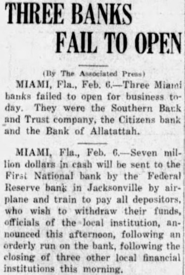 Runs forced the Citizens' Bank of Miami and the Bank of Allapattah to close.