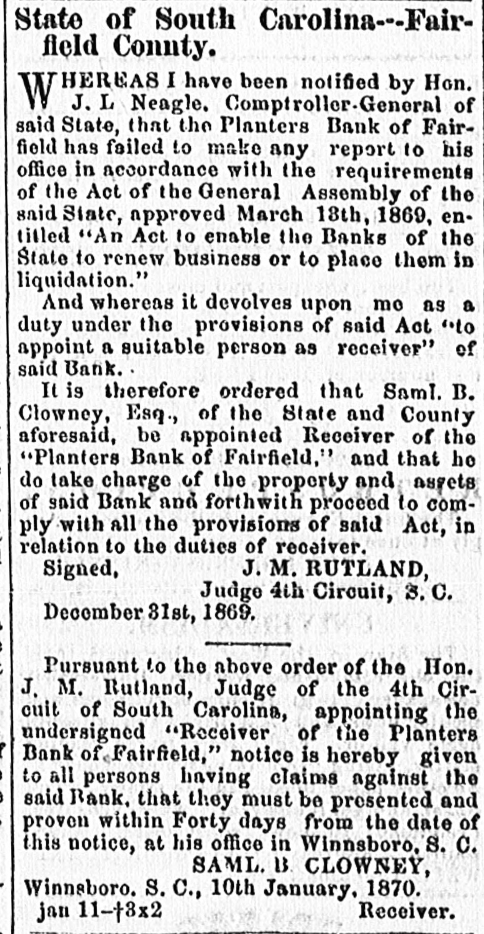State of South Carolina---Fairfield County. HEREAS I have been notified by Hon. W J. L Neagle. Comptroller-General of said State, that the Planters Bank of Fairfield has failed to make any report to his office in accordance with the requirements of the Act of the General Assembly of the said State, approved March 13th, 1869, entitled "An Act to enable the Banks of the State to renew business or to place them in liquidation." And whereas it devolves upon me as a duty under the provisions of said Act "to appoint a suitable person as receiver" of said Bank. It is therefore ordered that Sami. B. Clowney, Esq., of the State and County aforesaid, be appointed Receiver of the "Planters Bank of Fairfield," and that he do take charge of the property and assets of said Bank and forthwith proceed to comply with all the provisions of said Act, in relation to the duties of receiver. Signed, J. M. RUTLAND, Judge 4th Circuit, 3.C. December 31st, 1869. Pursuant to the above order of the Hon. J. M. Rutland, Judge of the 4th Circuit of South Carolina, appointing the undersigned "Receiver of the Planters Bank of Fairfield," notice is hereby given to all persons having claims against the said Bank, that they must be presented and proven within Forty days from the date of this notice, at his office in Winnsboro, S. C. SAML. B CLOWNEY, Winnsboro. S. C., 10th January, 1870. Receiver. jan 11-t3x2