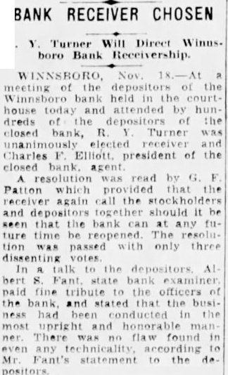 Ashton H. Williams was appointed the and Savbank of City upon the the The affairs the bank were deplorable shape, most assets having that there paying positors substantial dividend. worked Mr. and per paid the record. informed that the total expense not exthat the circuit judge who had jurisdition the matter, the statement that the liquidation Williams had been speedy and successful that additional would but funds had disbursed the additioncompensation could be provided this Upon made this case board the that At the Mr charge the hands tee and formation that expected worked liquidation whereby deposit the depositors per mitted thought Mr. Williams was the Trust Florence report the Palmetto Trust showed plan had the Bank Bank Trust the little Upon the felt urging the of Mr. affairs the Palmetto Bank cashier Carolina Florence the March that when the deposit by ting plan liquidation effect which in the Bank of all had received diviassets cent. The had divicent. estimated per the auditors there more $40,000 the and that the positors who did not take receive making total of 70 per per cent., this connection desire to call attention the that building of the Palmetto Bank Trust company was carried on opinion that my form liquidation, under $60,000 could have not secured property. Under the form liquidation Mr. received the An for purpose of putting this plan liquidation into effect. have been informed of those appraisers that the been the best interest of cerned. This office has never had any complaint depositor the Palmetto Bank Trust reference the Mr. Williams Dr. H. made this Barringer point Ashton Williams. first the old the bank receiving the closed. Mr. Williams opinion would of these ployes would great payment their salary would justified. Mr. Webopinion should and that ary should reduced. Bardecided Williams. whether the should be liquidated Mr. Webster not inclined plan; Williams was Barringer called and decided informed that these points major receivers In putting this of liquidation had filed claims notified writing that application would made the court for put plan plained detail and the receivers urged that any depositor any objection they should present objection writing. objection anyone. The Florence and referand who had an the sent their No objecPlanters' Bank, Lamar has follow in the the Merand Lamar, the two depositors, the stockholders Of gentleany matters by furBank of There appears criticism Foster's relative the Bank was, that officers attesting banking reduce Mr. FosMr had been Fant especially pointed the fact drafts and the officers bank in of the legal Again the states, thought was but his the early part the again August signifithe of his this president, "When Bank officers bank money any the brought my pressure part affairs the the Young, pointed the The endeavored be out that this office bringing the bank reduce liabilities may have above the co-operated the pointment Mr. presiand through Mr. ertions the without Citizens Taylors. In the HamCitizens' Bank Taylors, tention $22. 000 the state banking afterwards found to shortage. The Woodside interests being the largest stockholders in this bank, paid this ference with evident the alleged and promptly had it covered, stated, though the incident afterward brought the grand jury, bill found no prosecuthe the affairs avoid additional guaranbank Woodagreed up alleged was mill, then good stock the Woodsides paid guarantee one leaving only balance $11,500 unpaid. That the stocks since depreciated been foreseen at the arrangement, office be this and the the closing this of the quently this had particular ultimate balance guaranteed. That the bank closed before final collection the balance due the Woodsides regrettable though they payments and had saved depositors in the final liquidation That the transfer the the State which affiliatregrettable was entirely power province this office doing He was officer court and not the bank examiner's Testimony to the First National Bank of Batesburg covered evidence the State Bank of Citizens' Bank, not Mr. the Citizens bank the about During the administration of Mr. James Craig the department shortage excess 000 this the find the guilty party Craig sent special an officer the funds began the bank shortly Mr. by Mr. Bradley, Mr. Bradley the ings and the bank pay deposits full. This guarantee completed before the bank was remain closed; upon which the were all in full. There question who was responsible large shortage the the dicted. The was twice before the grand county evidence for an indictAbout called office there Mr. M. Huggins and Mr. requested that renew this clined then, vestigated the case. The investigation bringing out above stated facts, could for renewthe and hence dropped matter Touching so much of Mr. DuBose's has the Bank this state that the fully and allow of the amounts due them property any other the appointment receiver. matters for which he the matters entirely outside of Mr. W. Bailey. Mr. Bailey' banks, the State will have varied under the Winnsboro Bank, The criticisms adduced testimony covered discussing Winnsboro the under consideration further justification of the acts added that the Winnsboro depreciation its stocks and bonds. fluctuate times matter fact, there horizontal stocks and bonds New York market the mere mention foreign discuss, the president the Bailey's the and did not close the bank that appreciation the should viously stated, this old that the fullest confidence the and was fully cognizant what its closing would people Fairfield practice holding the banking fraternity the United States. Since the bank has closed receiver has obtained an order to further stocks bonds and frank think this right; was motive and me had the moral and legal right to act premises. Merchants Farmers' Bank, Spartanburg. Mr. Bailey's reference the Merchants Farmers' Spartanburg, from and correctly states amounts the however, to call the tention the that years this was one the 