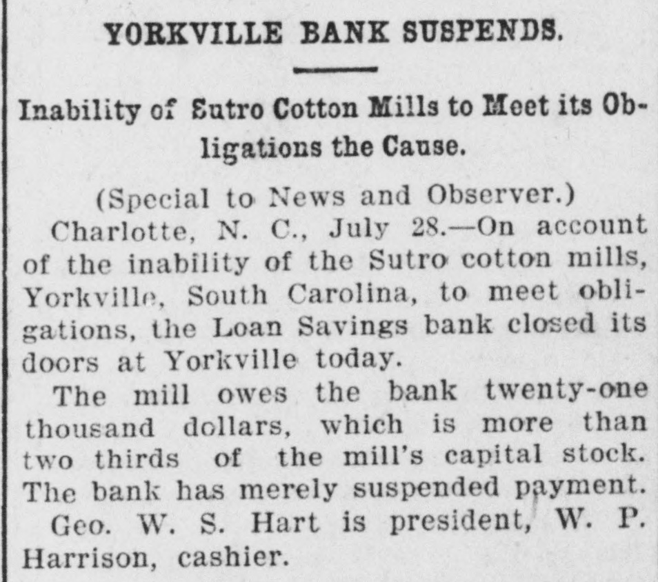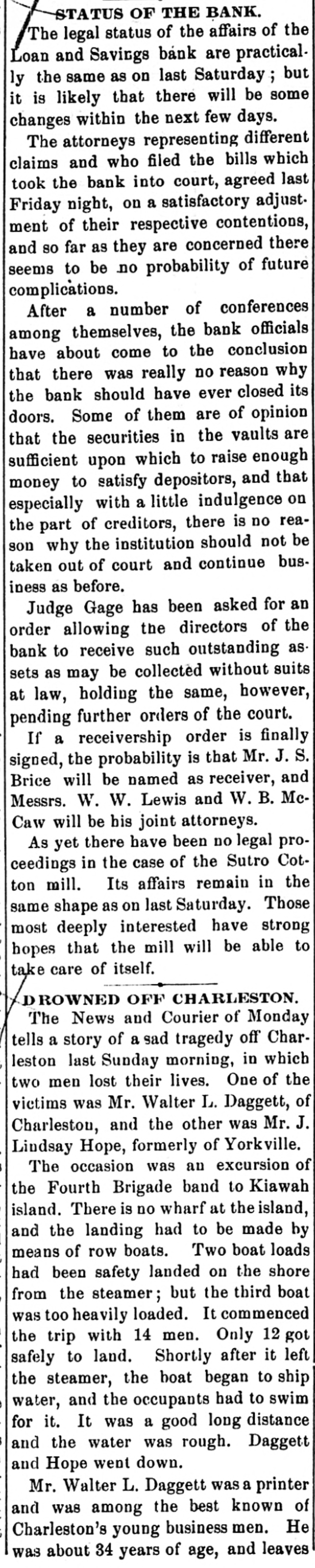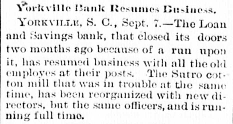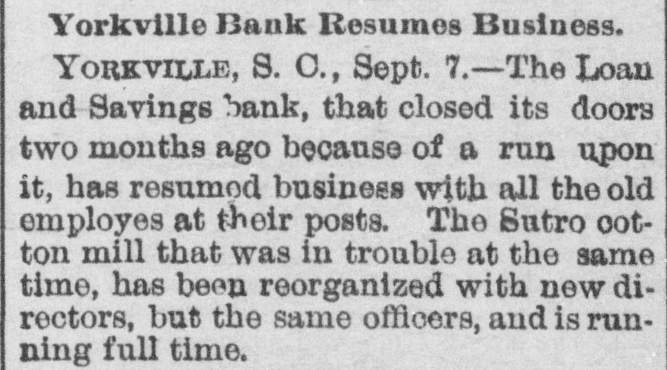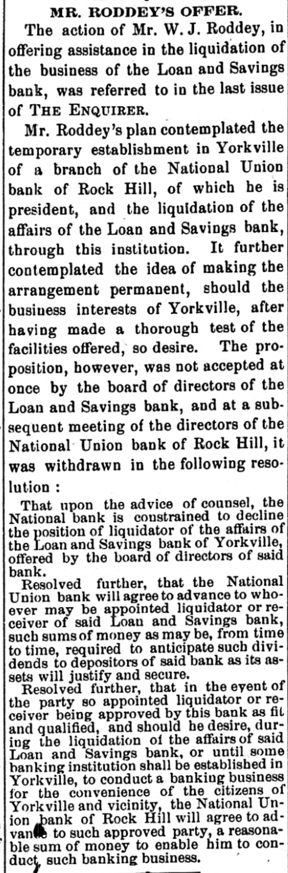 MR. RODDEY'S OFFER. The action of Mr. W. J. Roddey, in offering assistance in the liquidation of the business of the Loan and Savings bank, was referred to in the last issue of THE ENQUIRER. Mr. Roddey's plan contemplated the temporary establishment in Yorkville of a branch of the National Union bank of Rock Hill, of which he is president, and the liquidation of the affairs of the Loan and Savings bank, through this institution. It further contemplated the idea of making the arrangement permanent, should the business interests of Yorkville, after having made a thorough test of the facilities offered, so desire. The proposition, however, was not accepted at once by the board of directors of the Loan and Savings bank, and at a subsequent meeting of the directors of the National Union bank of Rock Hill, it was withdrawn in the following resolution : That upon the advice of counsel, the National bank is constrained to decline the position of liquidator of the affairs of the Loan and Savings bank of Yorkville, offered by the board of directors of said bank. Resolved further, that the National Union bank will agree to advance to whoever may be appointed liquidator or receiver of said Loan and Savings bank, such sums of money as may be, from time to time, required to anticipate such dividends to depositors of said bank as its assets will justify and secure. Resolved further, that in the event of the party so appointed liquidator or receiver being approved by this bank as fit and qualified, and should he desire, during the liquidation of the affairs of said Loan and Savings bank, or until some banking institution shall be established in Yorkville, to conduct a banking business for the convenience of the citizens of Yorkville and vicinity, the National Union bank of Rock Hill will agree to advance to such approved party, a reasonable sum of money to enable him to conduct such banking business.