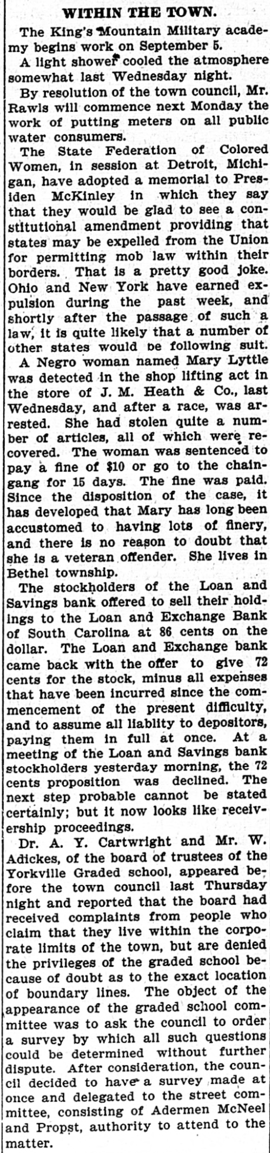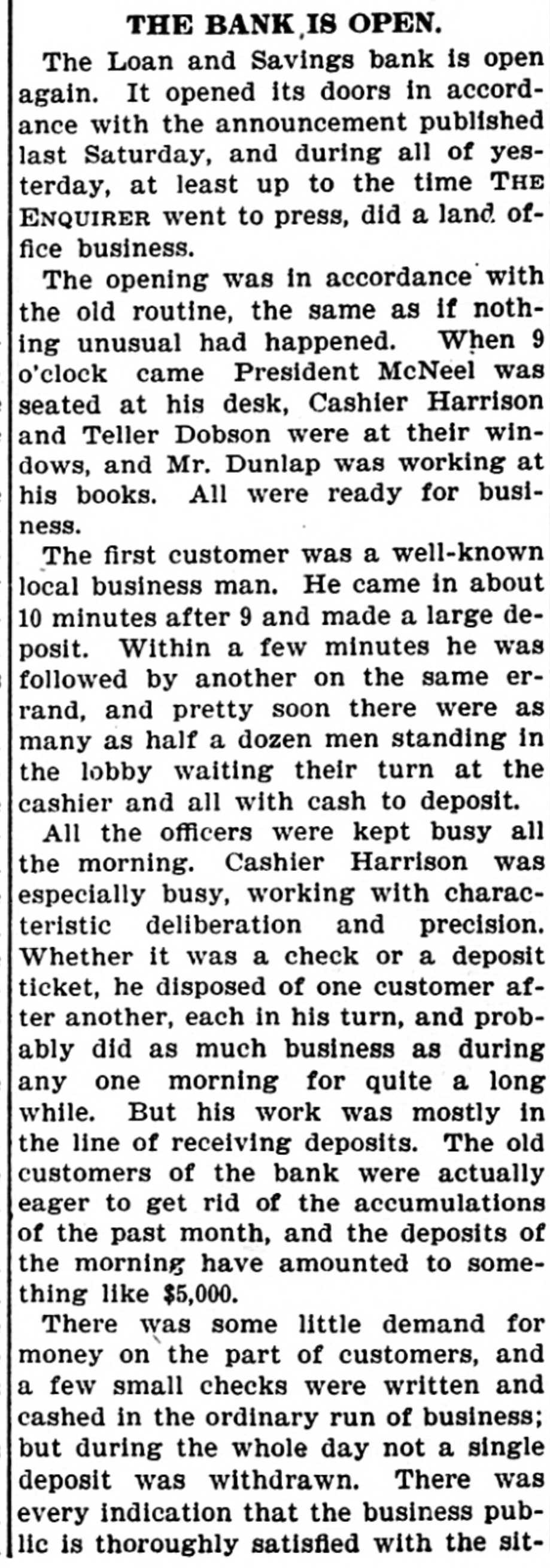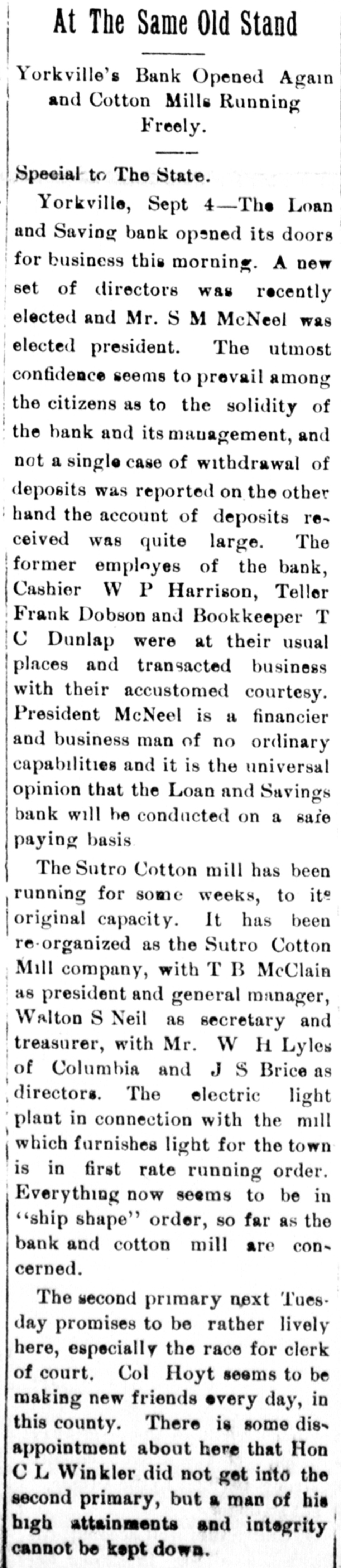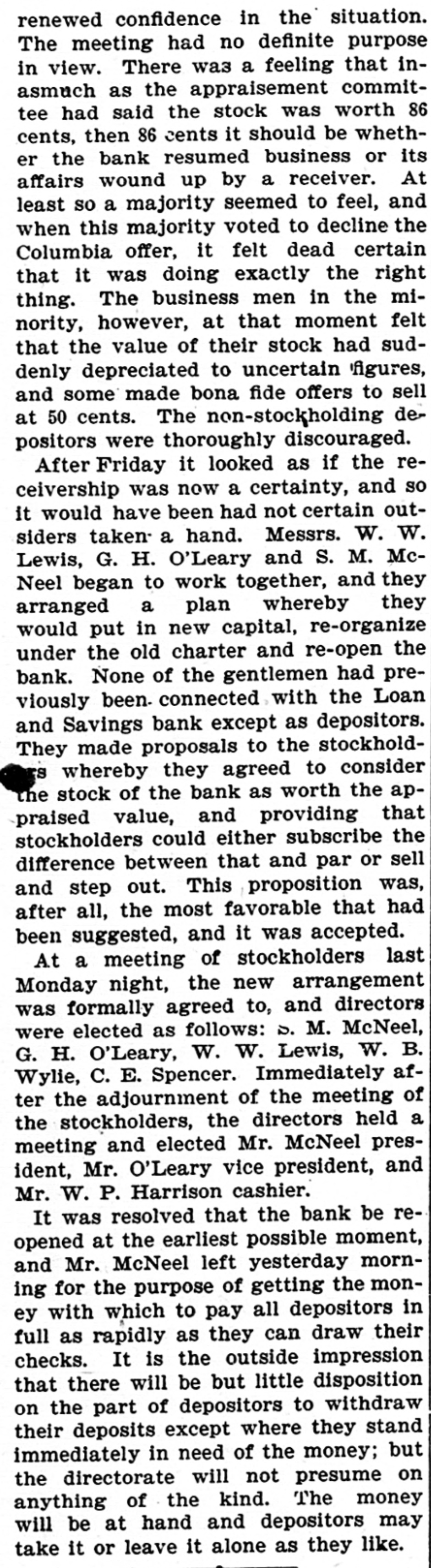 MR. RODDEY'S OFFER. The action of Mr. W. J. Roddey, in offering assistance in the liquidation of the business of the Loan and Savings bank, was referred to in the last issue of THE ENQUIRER. Mr. Roddey's plan contemplated the temporary establishment in Yorkville of a branch of the National Union bank of Rock Hill, of which he is president, and the liquidation of the affairs of the Loan and Savings bank, through this institution. It further contemplated the idea of making the arrangement permanent, should the business interests of Yorkville, after having made a thorough test of the facilities offered, so desire. The proposition, however, was not accepted at once by the board of directors of the Loan and Savings bank, and at a subsequent meeting of the directors of the National Union bank of Rock Hill, it was withdrawn in the following resolution : That upon the advice of counsel, the National bank is constrained to decline the position of liquidator of the affairs of the Loan and Savings bank of Yorkville, offered by the board of directors of said bank. Resolved further, that the National Union bank will agree to advance to whoever may be appointed liquidator or receiver of said Loan and Savings bank, such sums of money as may be, from time to time, required to anticipate such dividends to depositors of said bank as its assets will justify and secure. Resolved further, that in the event of the party so appointed liquidator or receiver being approved by this bank as fit and qualified, and should he desire, during the liquidation of the affairs of said Loan and Savings bank, or until some banking institution shall be established in Yorkville, to conduct a banking business for the convenience of the citizens of Yorkville and vicinity, the National Union bank of Rock Hill will agree to advance to such approved party, a reasonable sum of money to enable him to conduct such banking business.
