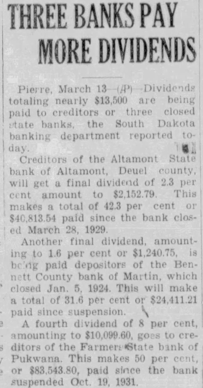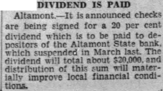 Altamont, S. D.-Special: Checks are being signed for 20 per cent dividend to be paid depositors of the Altamont State bank, which suspended last March. The dividend will total about $20,000.