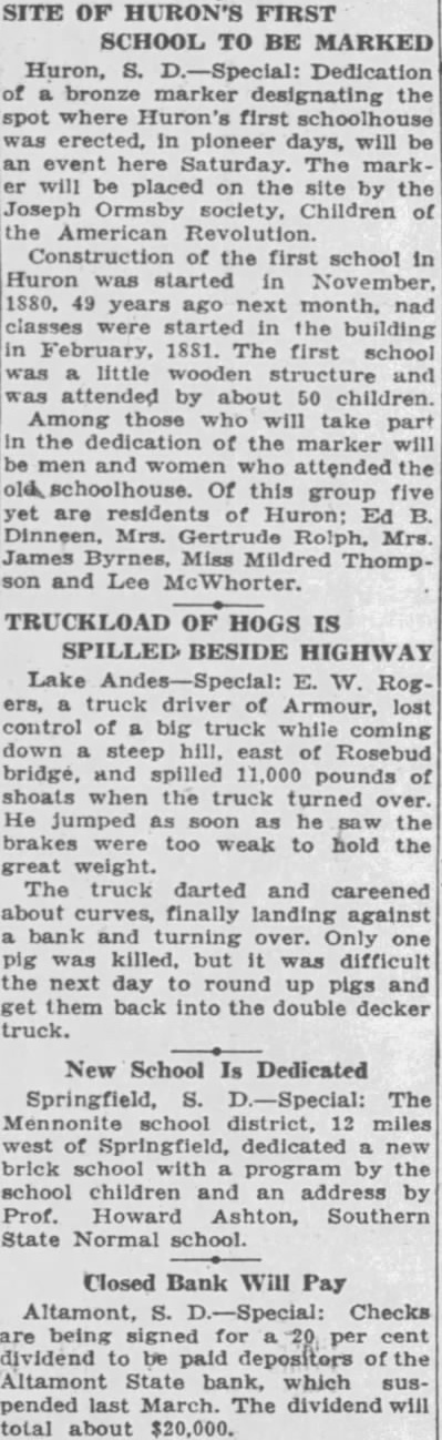 Huron, S. D.-Special: Dedication of a bronze marker designating the spot where Huron's first schoolhouse was erected. in pioneer days, will be an event here Saturday. The marker will be placed on the site by the Joseph Ormsby society, Children of the American Revolution. Construction of the first school in Huron was started in November, 1880, 49 years ago next month. nad started in the building in February, 1881. The first school was little wooden structure and attended by about 50 children. Among those who will take part In the dedication of the marker will be men and women who attended the old schoolhouse. Of this group five yet are residents of Huron: Ed B. Dinneen. Mrs. Gertrude Rolph. Mrs. James Byrnes, Miss Mildred Thompson and Lee McWhorter.