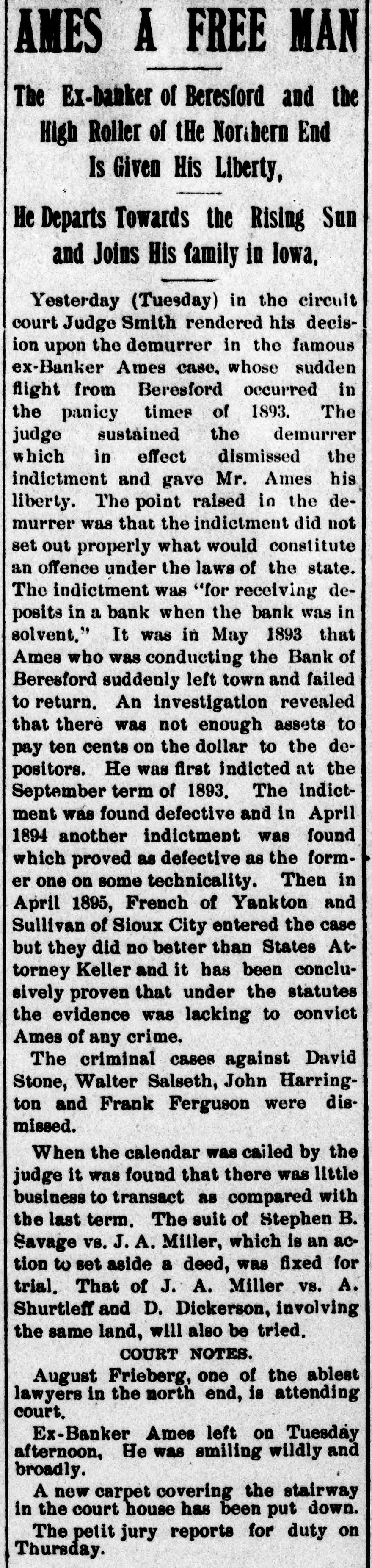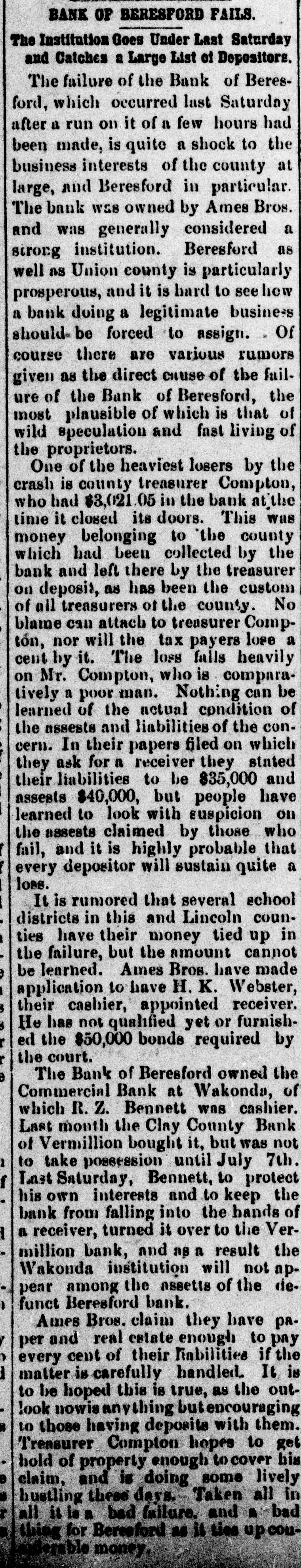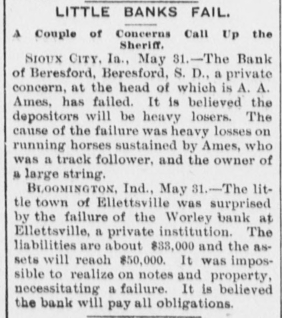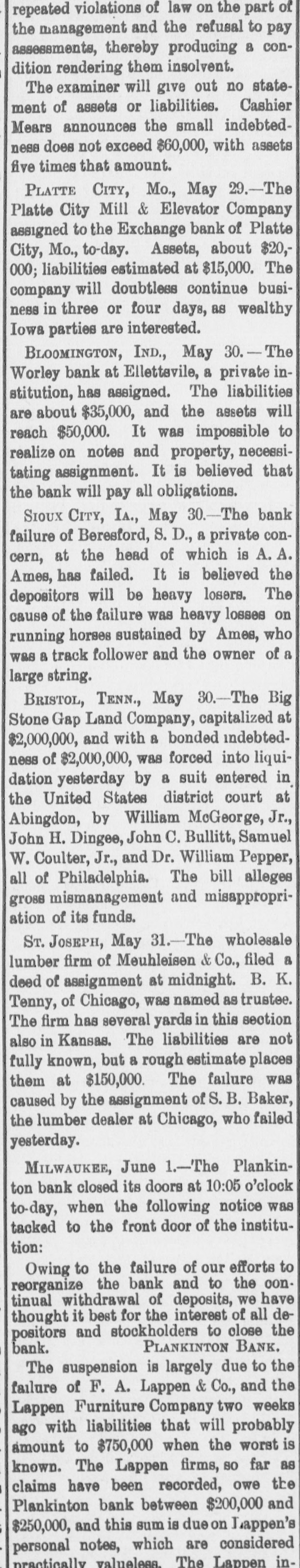 repeated violations of law on the part of the management and the refusal to pay assessments, thereby producing a condition rendering them insolvent. The examiner will give out no statement of assets or liabilities. Cashier Mears announces the small indebtedness does not exceed $60,000, with assets five times that amount. PLATTE CITY, Mo., May 29.-The Platte City Mill & Elevator Company assigned to the Exchange bank of Platte City, Mo., to-day. Assets, about $20,000; liabilities estimated at $15,000. The company will doubtless continue business in three or four days, as wealthy Iowa parties are interested. BLOOMINGTON, IND., May 30.-The Worley bank at Ellettevile, a private in stitution, has assigned. The liabilities are about $35,000, and the assets will reach $50,000. It was impossible to realize on notes and property, necessitating assignment. It is believed that the bank will pay all obligations. SIOUX CITY, IA., May 30.-The bank failure of Beresford, S. D., a private concorn, at the head of which is A. A. Ames, has failed. It is believed the depositors will be heavy losers. The cause of the failure was heavy losses on running horses sustained by Ames, who was a track follower and the owner of a large string. BRISTOL, TENN., May 30.-The Big Stone Gap Land Company, capitalized at $2,000,000, and with a bonded indebtedness of $2,000,000, was forced into liquidation yesterday by a suit entered in the United States district court at Abingdon, by William McGeorge, Jr., John H. Dingee, John C. Bullitt, Samuel W. Coulter, Jr., and Dr. William Pepper, all of Philadelphia. The bill alleges gross mismanagement and misappropriation of its funds. ST. JOSEPH, May 31.-The wholesale lumber firm of Meuhleisen & Co., filed a deed of assignment at midnight. B. K. Tenny, of Chicago, was named as trustee. The firm has several yards in this section also in Kansas. The liabilities are not fully known, but a rough estimate places them at $150,000. The failure was caused by the assignment of S.B. Baker, the lumber dealer at Chicago, who failed yesterday. MILWAUKEE, June 1.-The Plankinton bank closed its doors at 10:05 o'clock to-day, when the following notice was tacked to the front door of the institution: Owing to the failure of our efforts to reorganize the bank and to the oontinual withdrawal of deposits, we have thought it best for the interest of all depositors and stockholders to close the PLANKINTON BANK. bank. The suspension is largely due to the failure of F. A. Lappen & Co., and the Lappen Furniture Company two weeks ago with liabilities that will probably amount to $750,000 when the worst is known. The Lappen firms, so far as claims have been recorded, owe the Plankinton bank between $200,000 and $250,000, and this sum is due on Lappen's personal notes, which are considered practically valueless. The Lappen in-